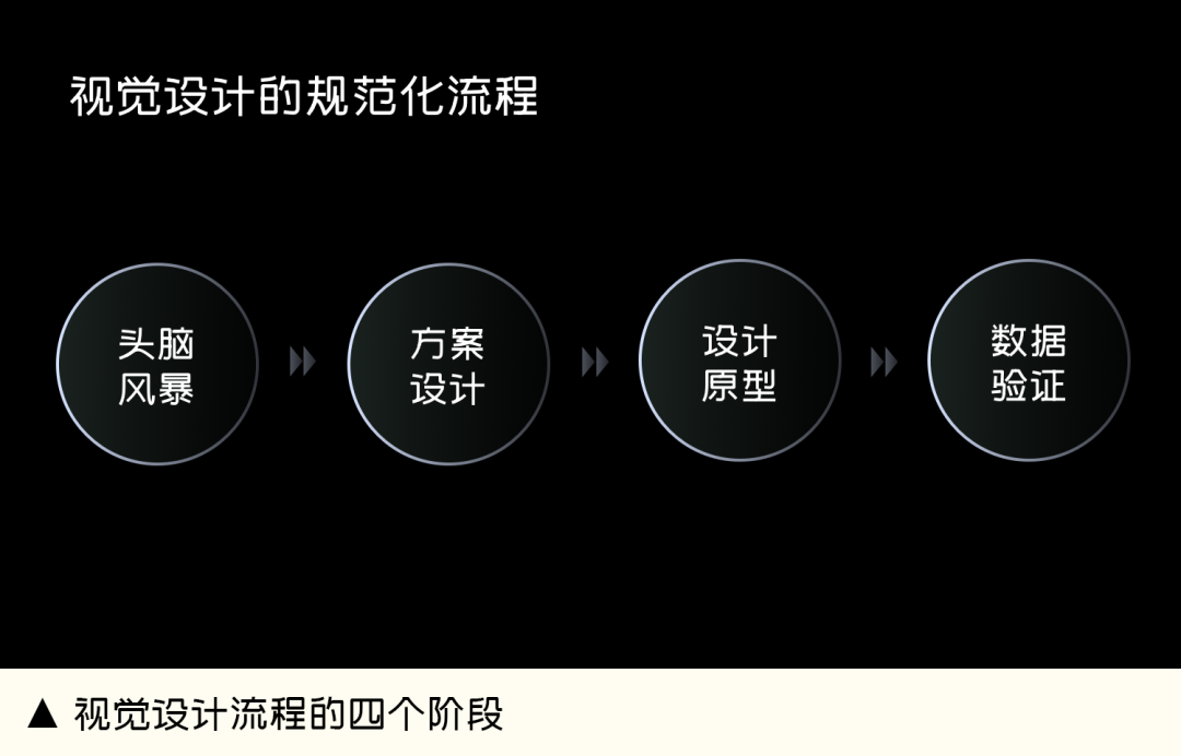 为了打造更优质的用户体验,我们除了对用户需求进行研究分析,必须还要拥有一套规范化的视觉设计流程。规范化的视觉设计流程一般分为四个阶段,首先是头脑风暴阶段,之后是方案设计阶段,接着是设计原型阶段,最后就是数据验证阶段。
