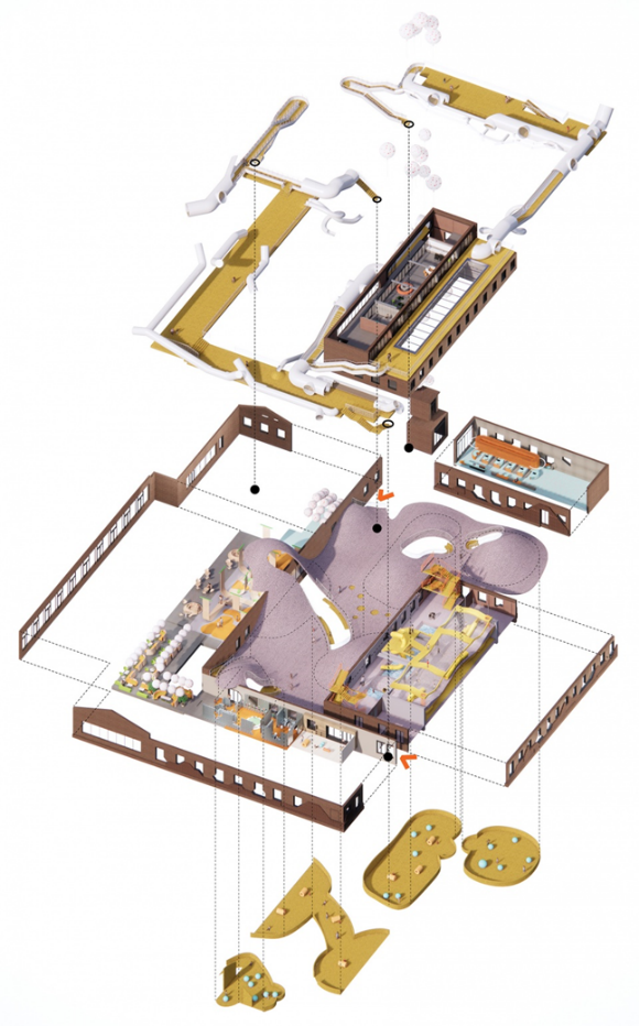 整个场地由五栋建筑组成半围合式的街区,屋顶平台通过管道串联成一个环形系统。屋顶平台作为辅助休息区也是室外游乐区,通过小山和滑筒交叉连接,环形的动线使得屋面承载了疏散以及动线交通的主要功能。