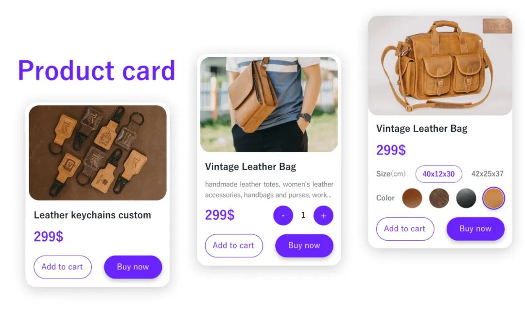 产品卡片设计广泛用于网站和电子商务应用程序。它旨在吸引买家对产品的兴趣。在设计过程中,如果使用视觉层次可以使产品卡片更有效率。通常产品图像比其他内容大,其次是产品和价格。