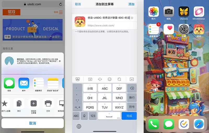 首先从 Safari 访问优设网站,点击屏幕下方的共享图标并选择「添加到主屏幕」的选项,将桌面显示图标命名为「优设」保存到桌面。自己「DIY」一个「优设 App」方便随时浏览 。