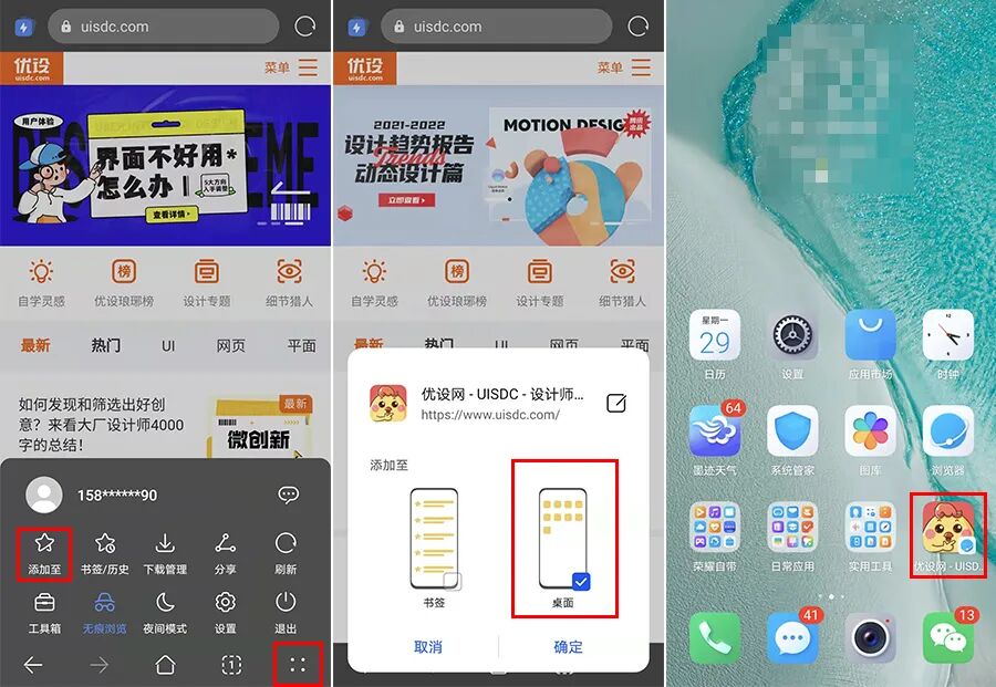 同样打开手机自带浏览器并访问优设网站,点击下方「∷」按钮,选择「☆添加至」——「桌面」即可完成添加。