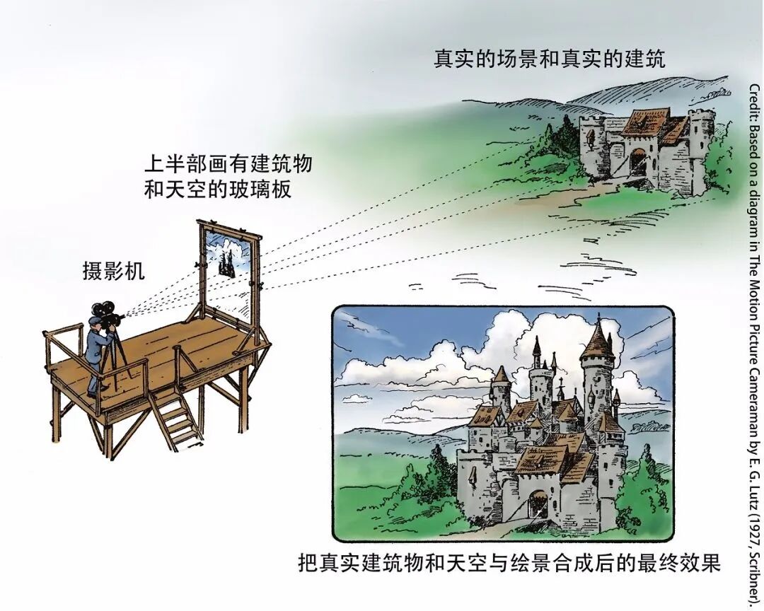 随着时代的进步和电影工业的发展,人们借助CG技术,以计算机图像“层”的概念完美取代了以往的“玻璃板”,可以通过虚拟数字技术将数字绘景和3D环境结合起来,创建完整的摄影场景或者对已有场景进行扩充修饰。3D环境的创作变得更为精确、易操作,更具创造性,往往可以创造出以假乱真的场景。
