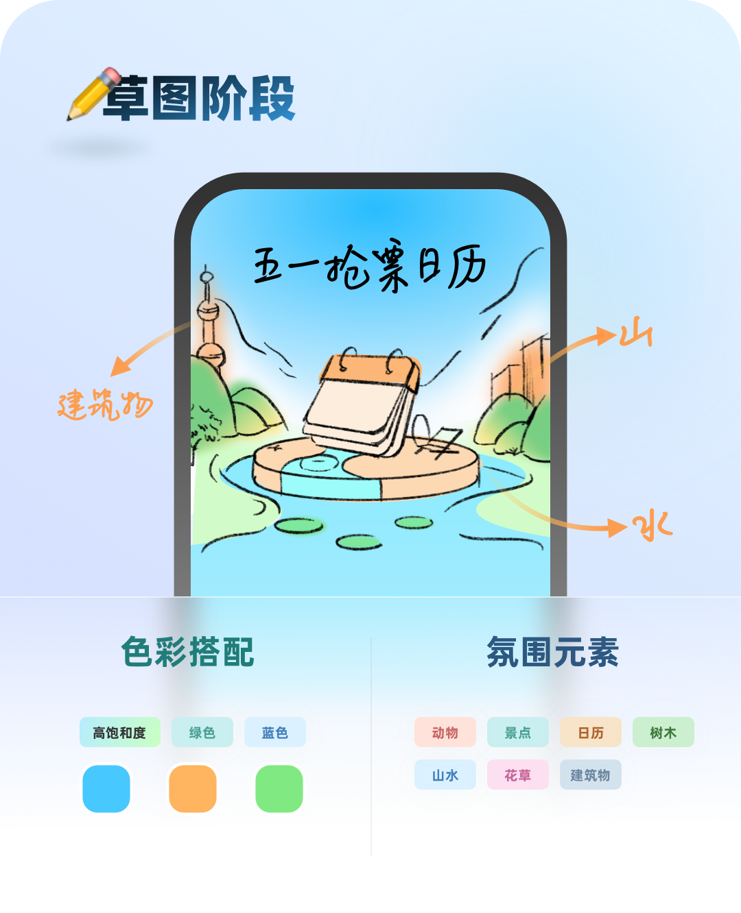 通过关键词的推导,设计目标的确定,针对其进行视觉语言的演绎。草图阶段尝试了多种草图创意表现,考虑到各个业务线的复用性,文案信息的清晰传达,前中后景的空间层次等维度,确定了本次五一抢票日历的草图。