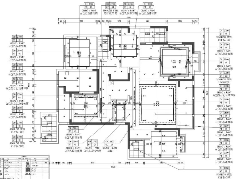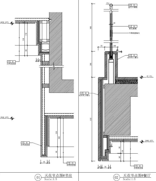 a、标注:每个造型的标高、尺寸、材质等(只标造型尺寸,不要标灯具)。