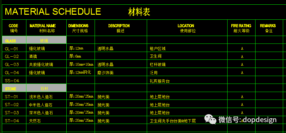 与设计说明相类似的,项目材料表在自审图纸时,需注意工程概况内容、精装修设计范围、各类图例说明、材料与工艺的说明、各类规范要求等。