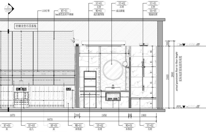 e、立面的标高标注是否与平面图保持一致:立面标高需按照天花图和地坪图核实,特别注意天花造型标高及卫生间标高是否特殊。