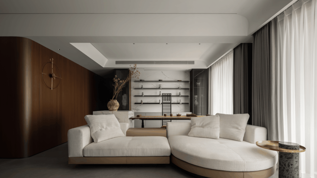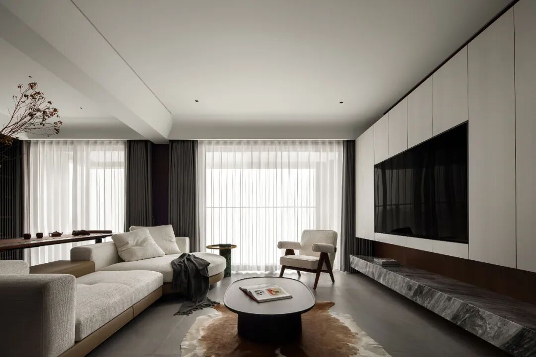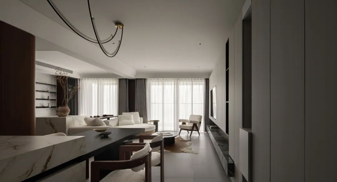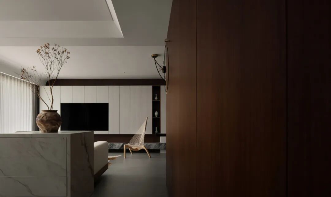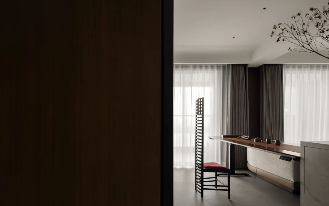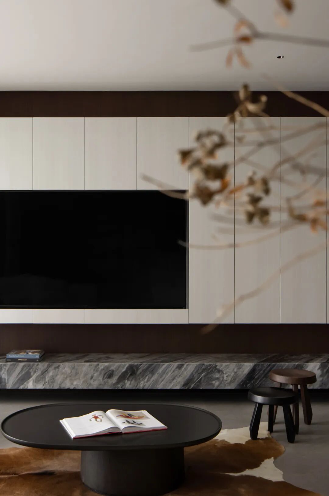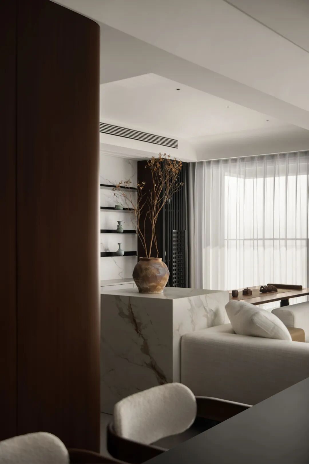 立面转折之际,激发出重轻相间的视觉张力,构建悬空形态,平衡由重量感,同时结合大理石、皮质、布艺等材质,将色彩温度、错落美学、点睛装饰逐次共和,树立起会客场域的气度与韵味。