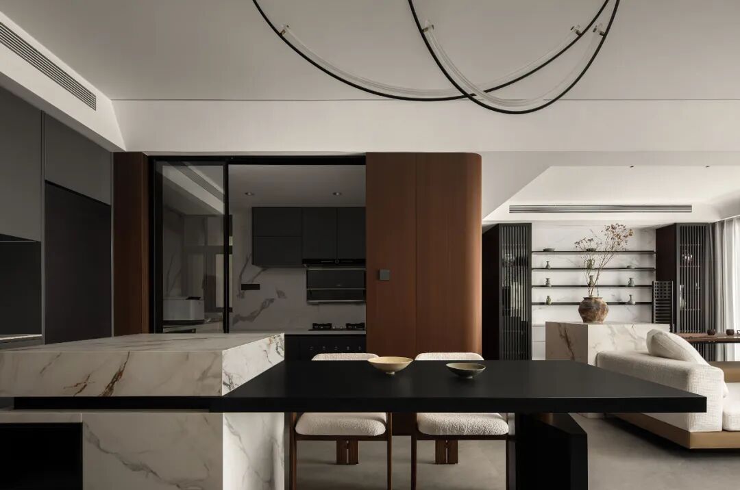 深灰基调分上下层次,由或粗或细的直线修饰,辅以雅白贴面及其自然图纹,整合了厨房的视感,将高级、简约、实用的特征推向视觉前端,拓展烹煮过程的乐趣,缩短清洁归纳的时间,提高生活效率,意蕴无穷。