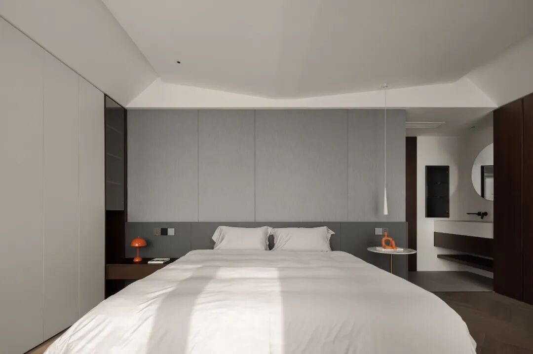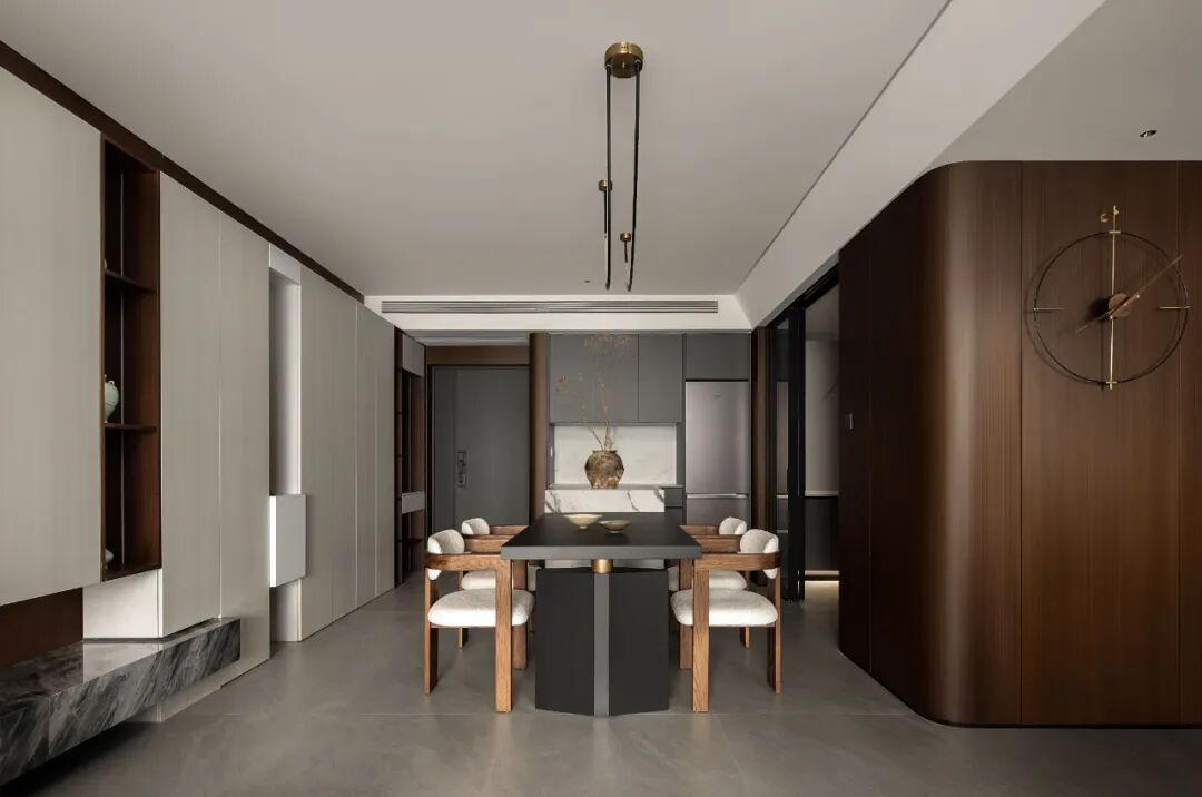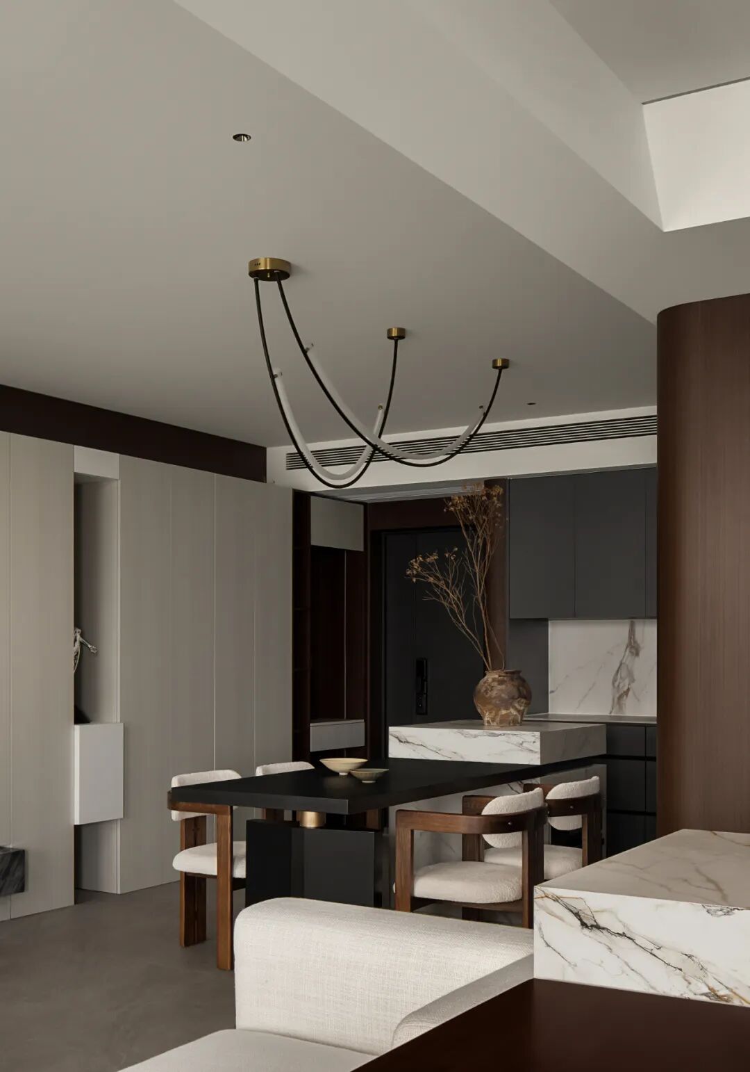 客餐厅以布局强调空间的叙事力,糅合温润质感与纯粹色彩,时刻准备着刻录家庭生活的点点滴滴,退而静雅,进而畅通。以体块拟态横向坐标轴,改变纵向尺度,达成生动的意趣性、探索性与艺术性。