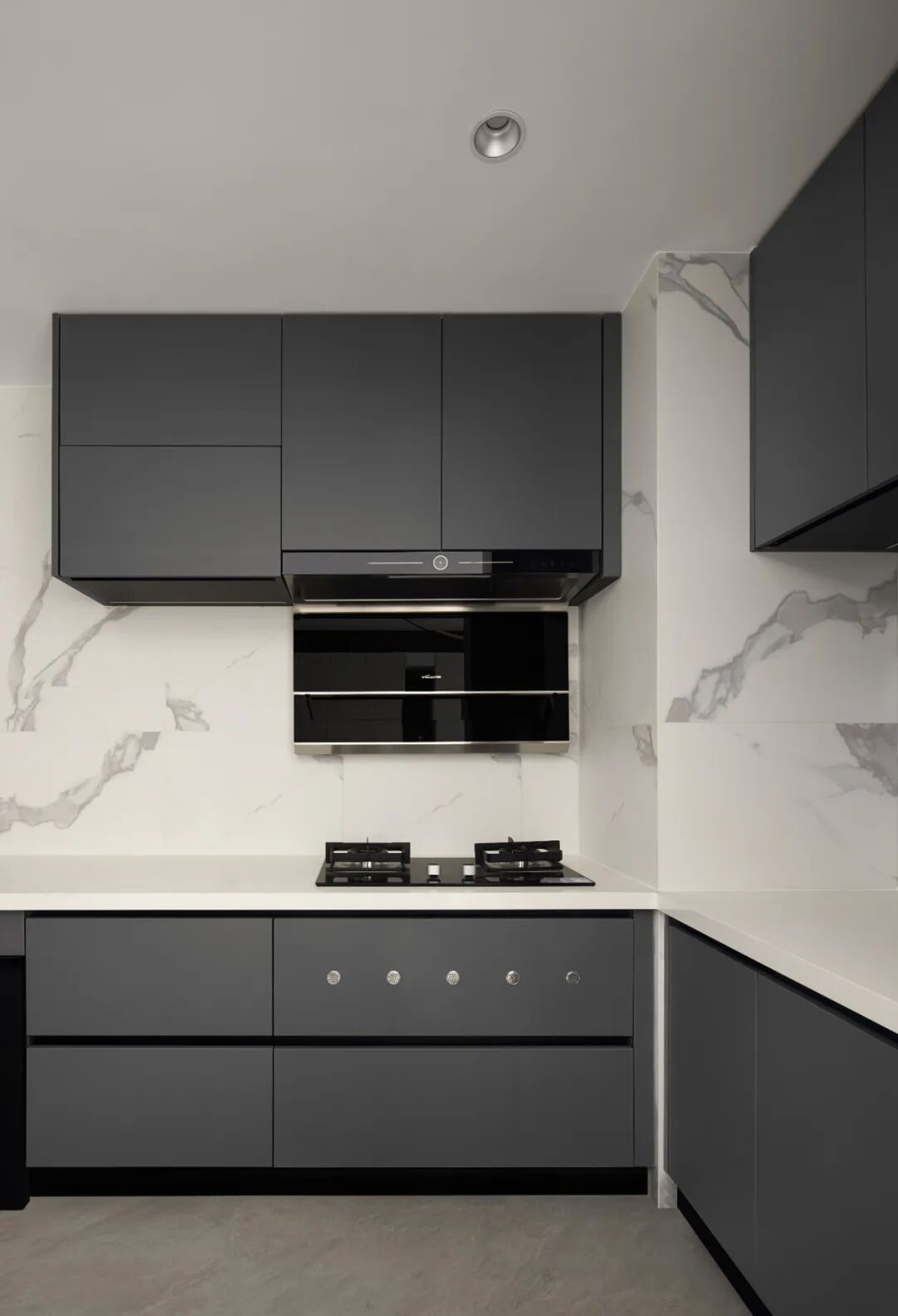 The dark gray tone is divided into upper and lower levels, which is modified by thick or fine straight lines, supplemented by elegant white veneer and its natural pattern. It integrates the visual sense of the kitchen, pushing the advanced, simple and practical characteristics to the visual front end, expanding the fun of the cooking process, shortening the time of cleaning and induction, improving life efficiency, and has infinite implications.