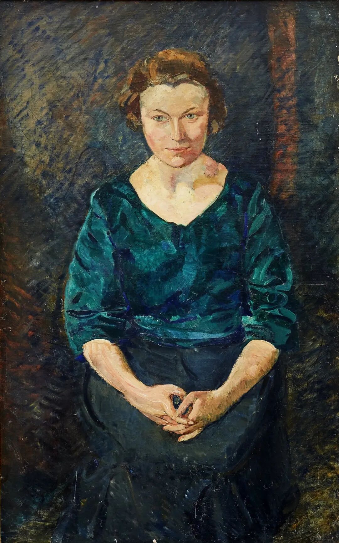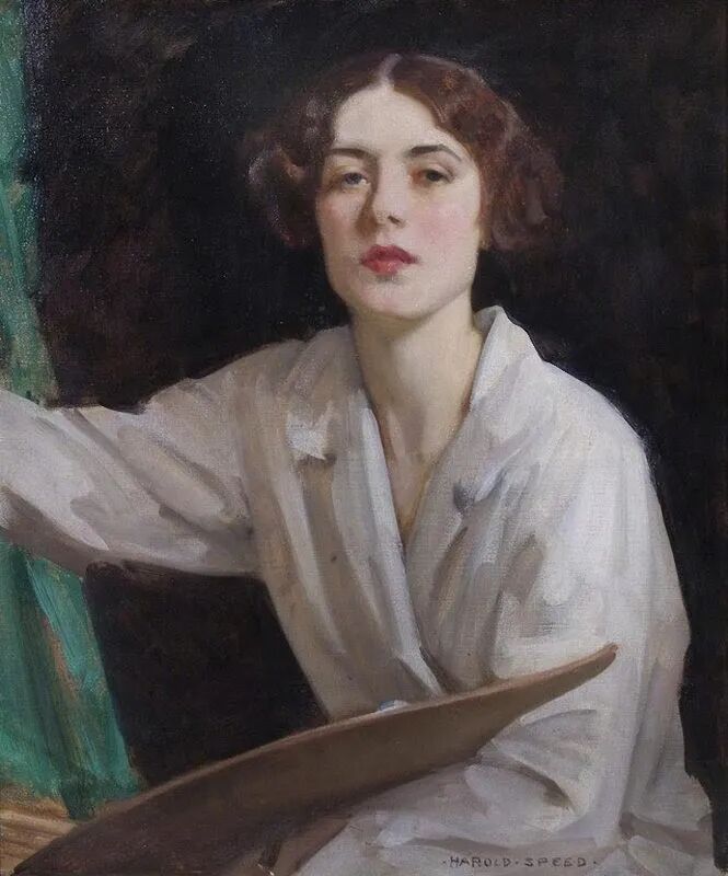 这幅肖像画很写实,而且在当时是非常规的,描绘了一位工作中的女艺术家(坐在地板上,手里拿着粘土),而不是穿着适当的资产阶级服装。