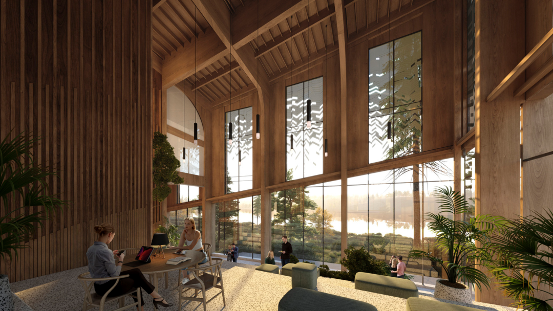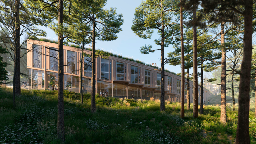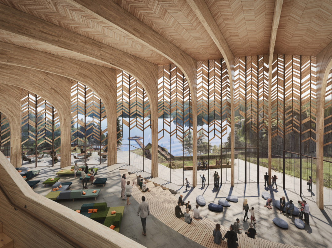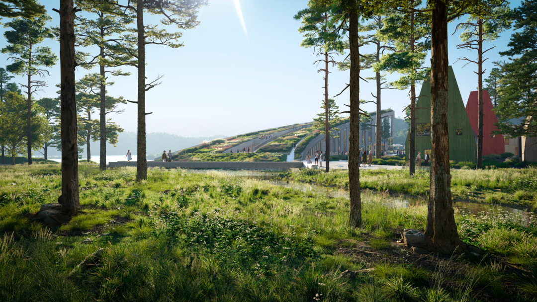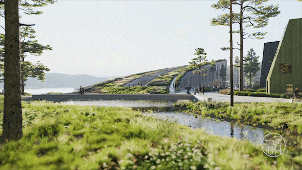 本案开发的第一阶段是由 Snøhetta 设计的 Lakehouse,这是一座与景观融为一体的纯木制公共建筑。