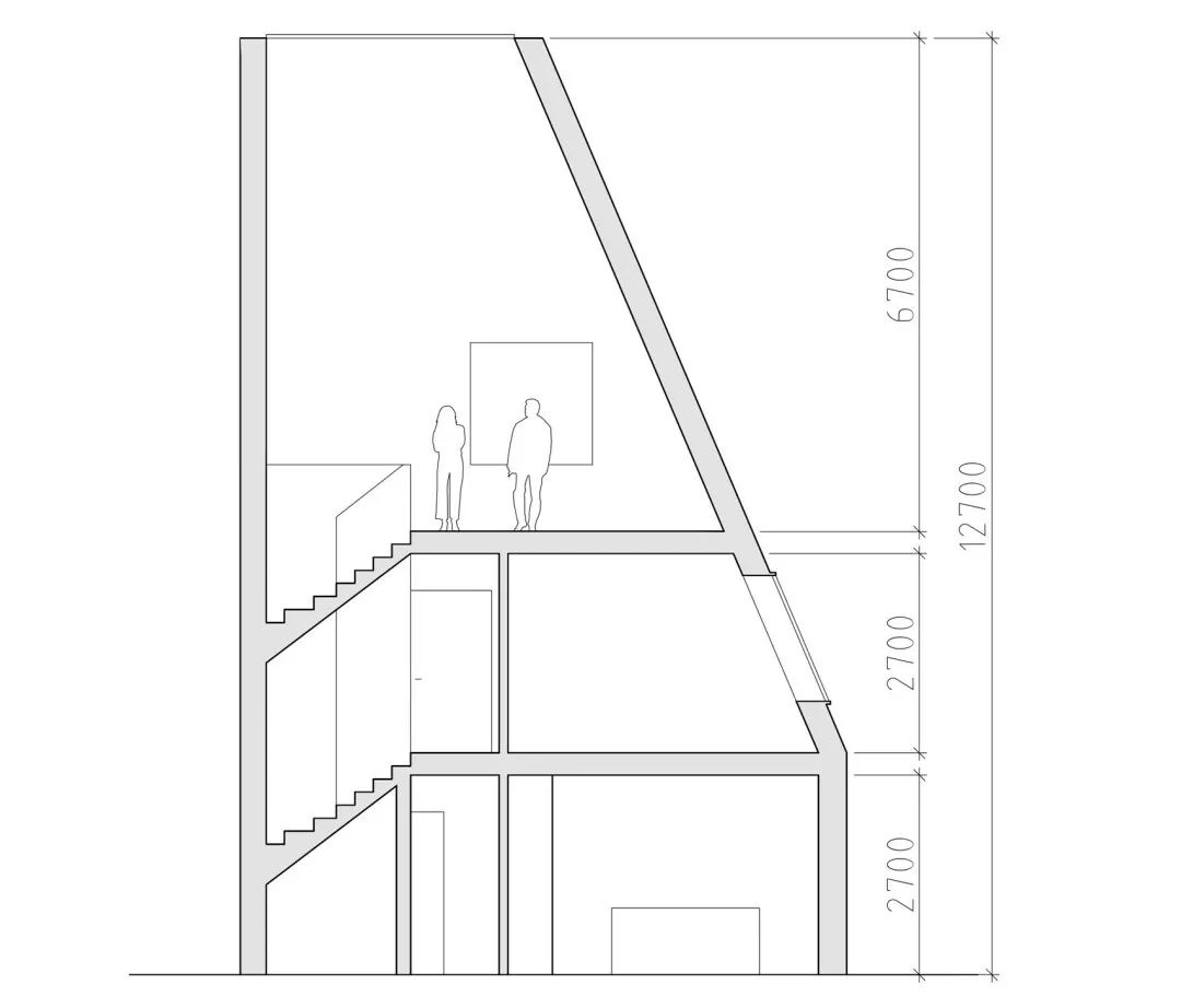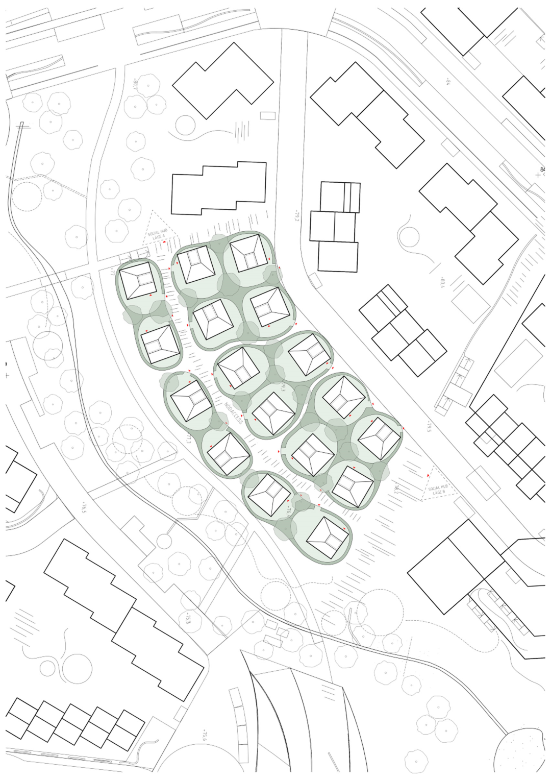 最终规划为一个 2,550 ㎡的密集住宅方案,包括 17 座三层高的独栋住宅,有着大方窗户的不对称外观。