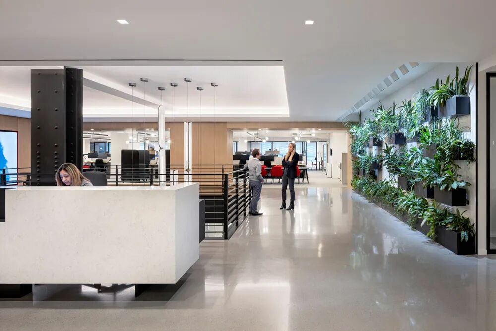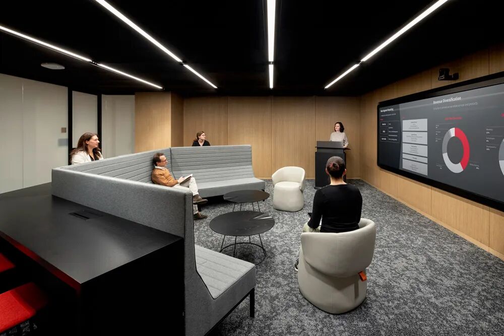 五楼是迎接员工和客人的主要接待区,这里设有悬臂式接待台,位于中央楼梯(连接3-5层)的前面。楼梯的一侧是媒体墙,另一侧是绿植墙。每一层楼都有一个精心设计的亲生物区域。接待区的近旁,还有一个供客户演示的技术实验室,这里装饰以金属网天花板、冲孔木板以及屏幕墙。此外,在五楼的西北侧,规划了一处强大且多元的会议中心。