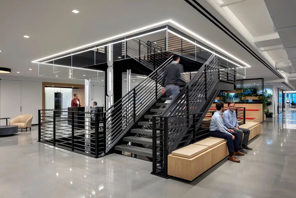 围绕着中央楼梯,整合了形式多样的创新空间,以支持各种敏捷、灵活的工作需求。如长凳座椅、阶梯座、以及用于非正式工作的小桌子。这些小空间都配备了内置电源和网线,以支持密集型技术性工作任务。