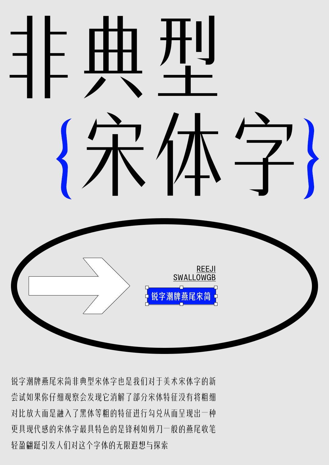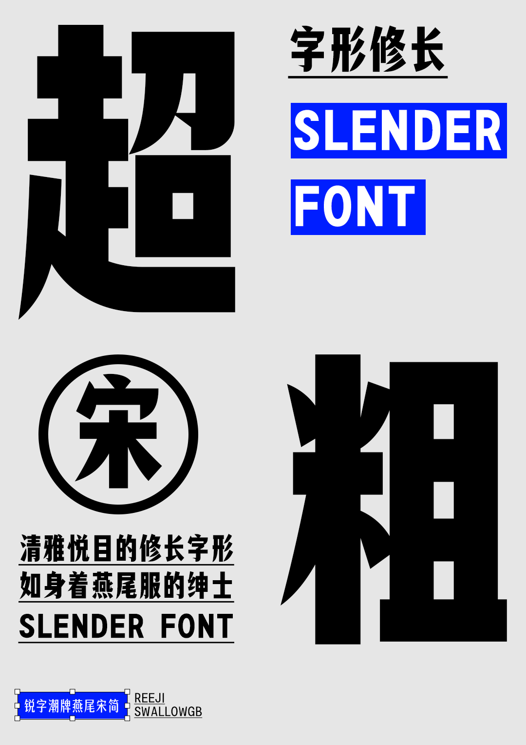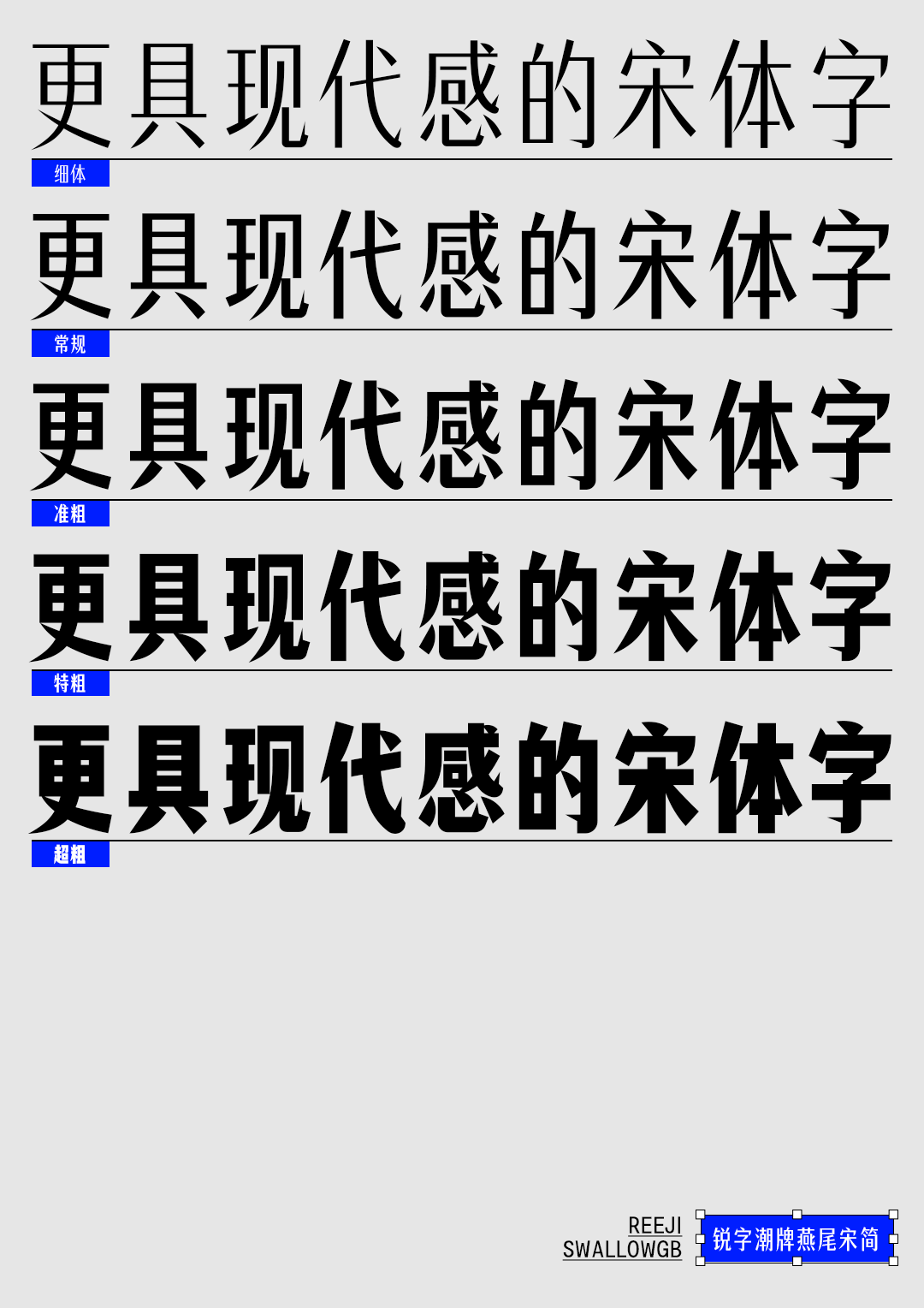 锐字潮牌燕尾宋简,一款非典型宋体字,它简化了部分宋体字特征,横竖笔形粗细视觉相等,从而呈现出一种更加简约、更具现代感的宋体字。