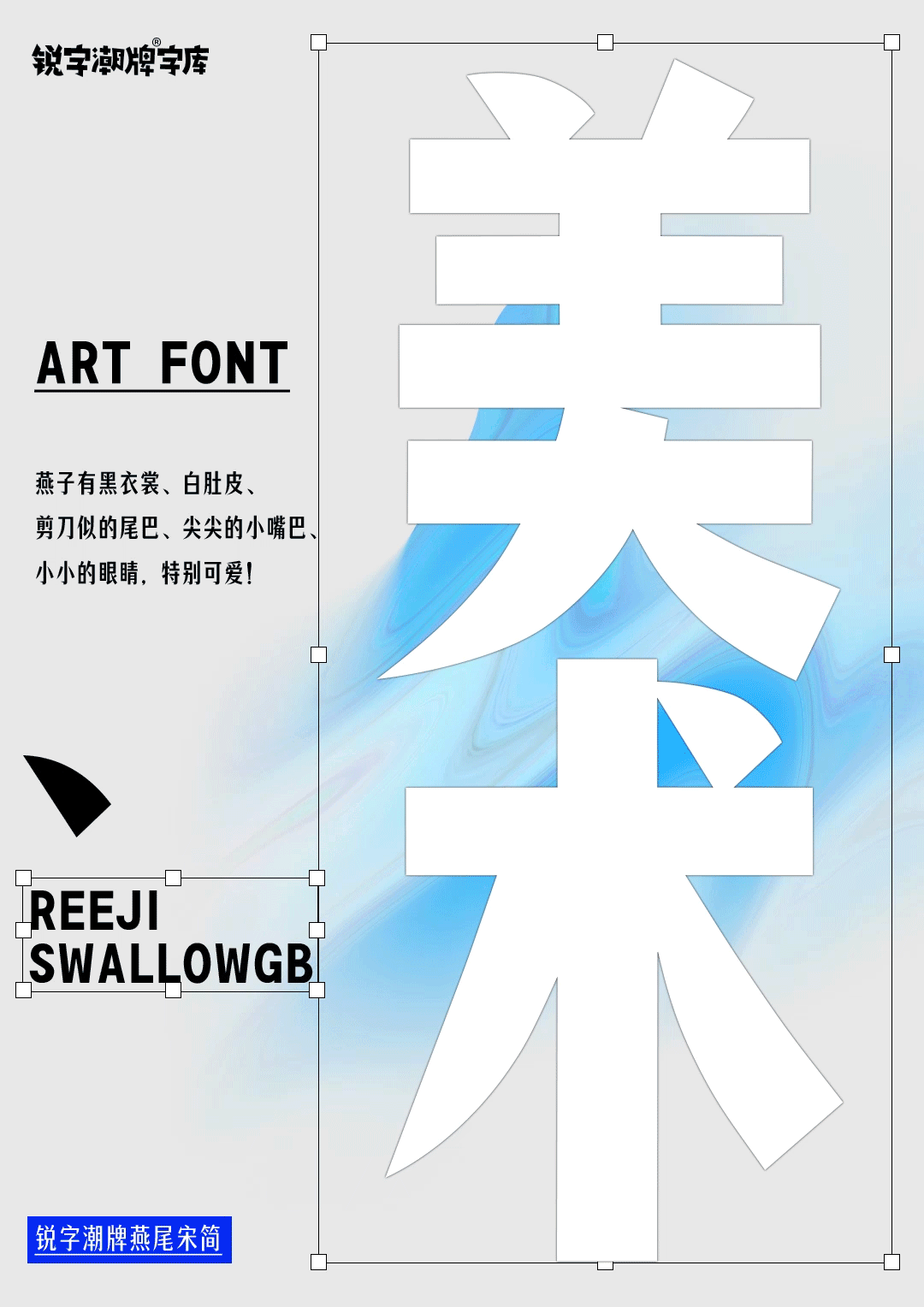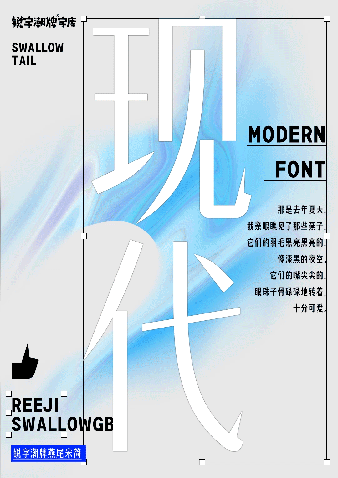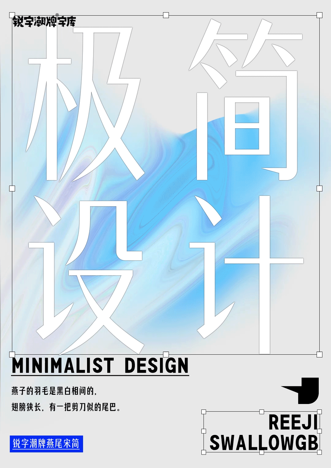 锐字潮牌燕尾宋简,一款非典型宋体字,它简化了部分宋体字特征,横竖笔形粗细视觉相等,从而呈现出一种更加简约、更具现代感的宋体字。