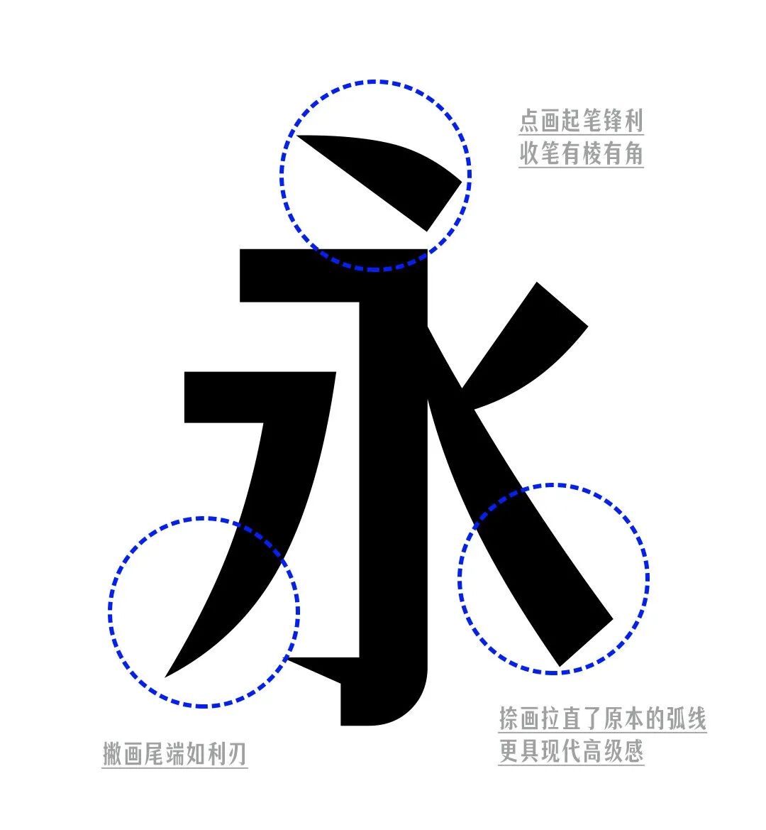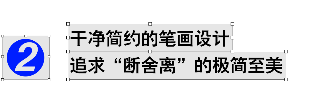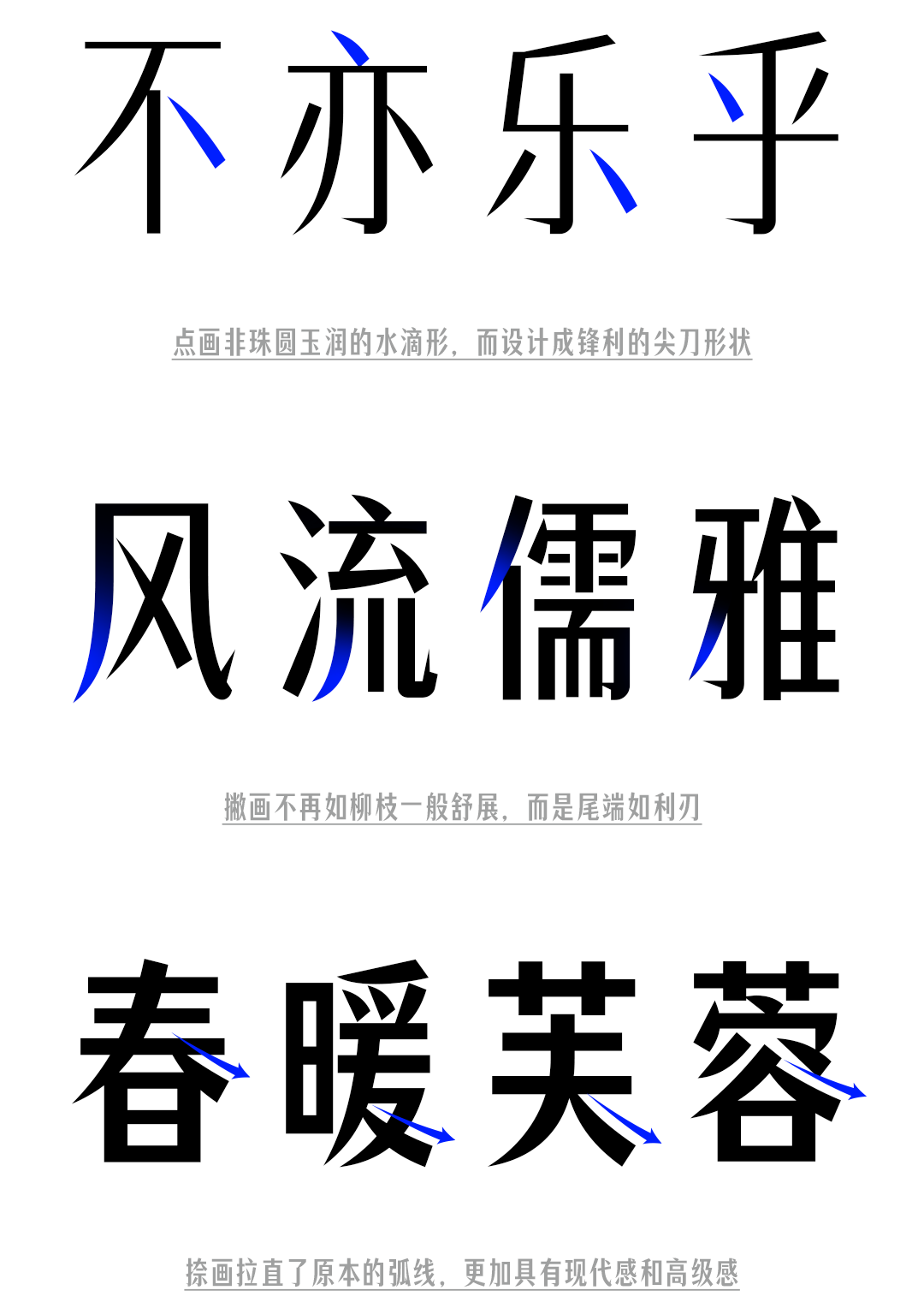 将宋体的三角装饰衬线全部简化,做出“断舍离”理念的极简设计,只保留了最突出的笔画末端装饰、笔画粗细转换等。