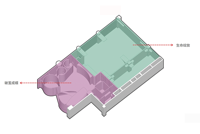 空间形态上分为“蜕变”和“绽放”两部分。即通过不断的修行以求得到破茧、蝶变、重生,并最终绽放成为美的演变过程,以此作为空间的动线,通过先抑后扬的空间情绪变化将整体空间分为了曲水流畅、思享家、泊心亭、美习社、美学社等区域。