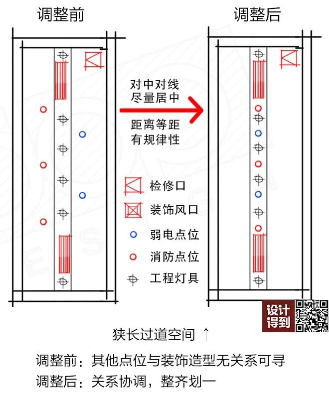 ① 考虑装饰美观性:即上面提到的综合天花布置原则,检修口应对中对线,尽量居中,距离等距,有规律性,且与周边环境有关系可寻。