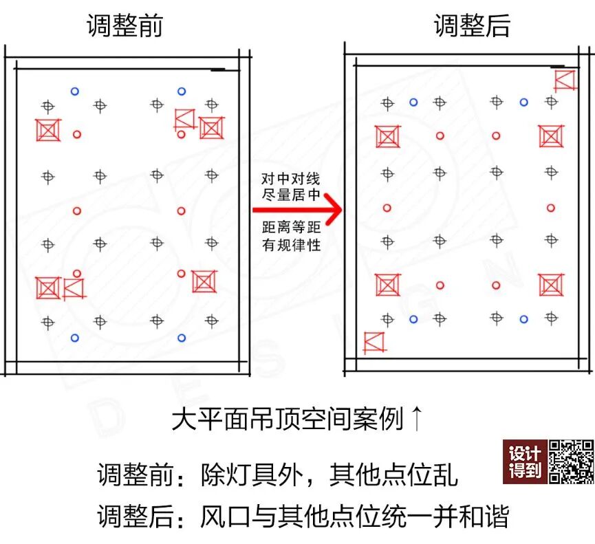 同时,综合天花图允许以装饰图为主,调整周边与装饰点位有冲突其他点位。但是调整幅度不可过大,应尽量在其他专业点位周边改动,调整完后,需同各专业设计师共同确认点位调整的合理性,才能准许出图。”