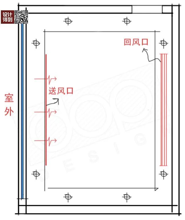 ⑤  由于建筑外侧温度变化较大,为保证空调效果,最好在靠近建筑外侧送,内侧回;不然若从室内往建筑外侧吹,则很可能由于温差及气压的原因,靠建筑外侧的区域的空调效果不明显。