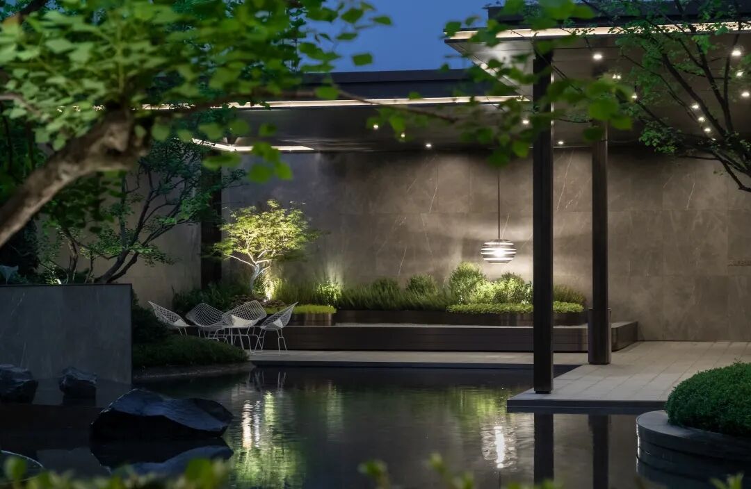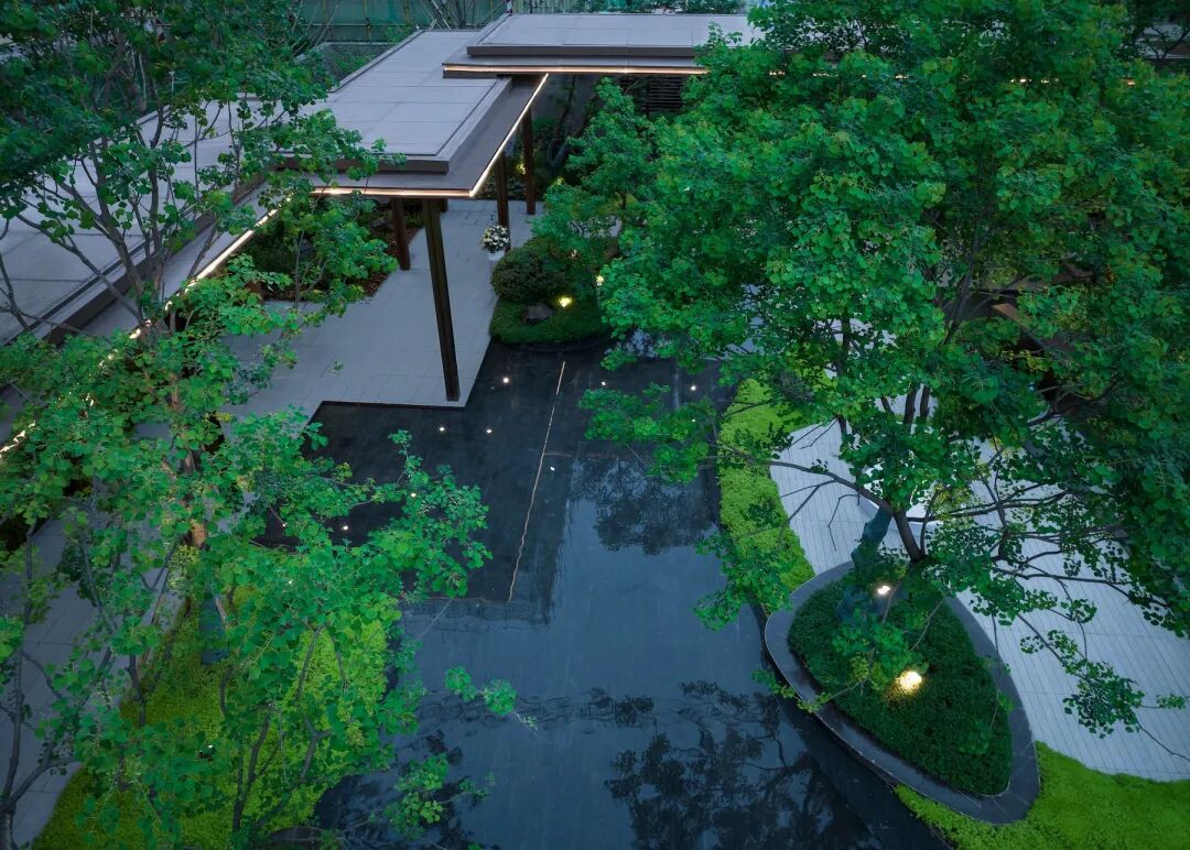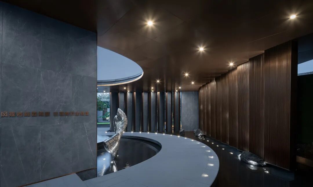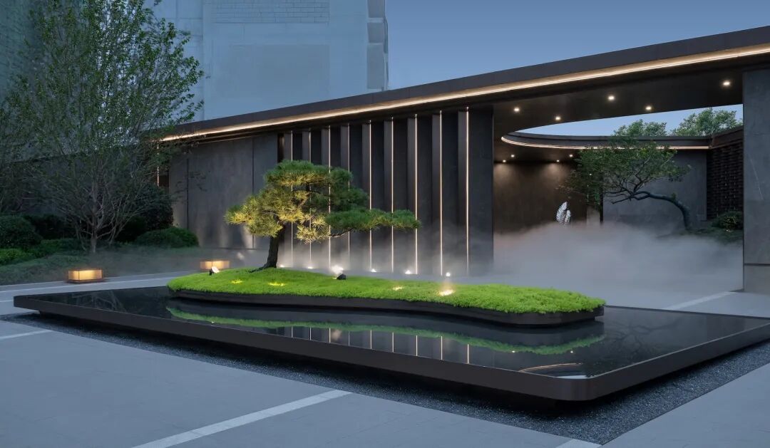 孤植黑松伴光洁之水,如镜般将现象倒映。细致刻画两者合二为一般的一体感镜池工艺,焕发空间的空灵感与悠远意蕴,透露温润雅静的迎宾之礼。