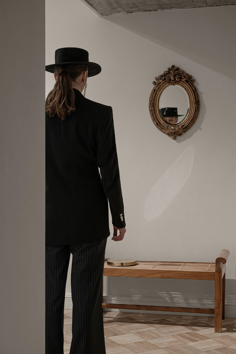 入口大厅的左侧是厨房、储藏室和会议室。这个房间专为 VIP 客户和 Ruslan 团队之间的舒适交流而设计。在房间中央,Vasya Grublyak 定制的优雅木制枝形吊灯 «Spirits» 引起了人们的注意。沿着墙壁有一个控制台和架子,用于放置季节性系列的配件和商品。