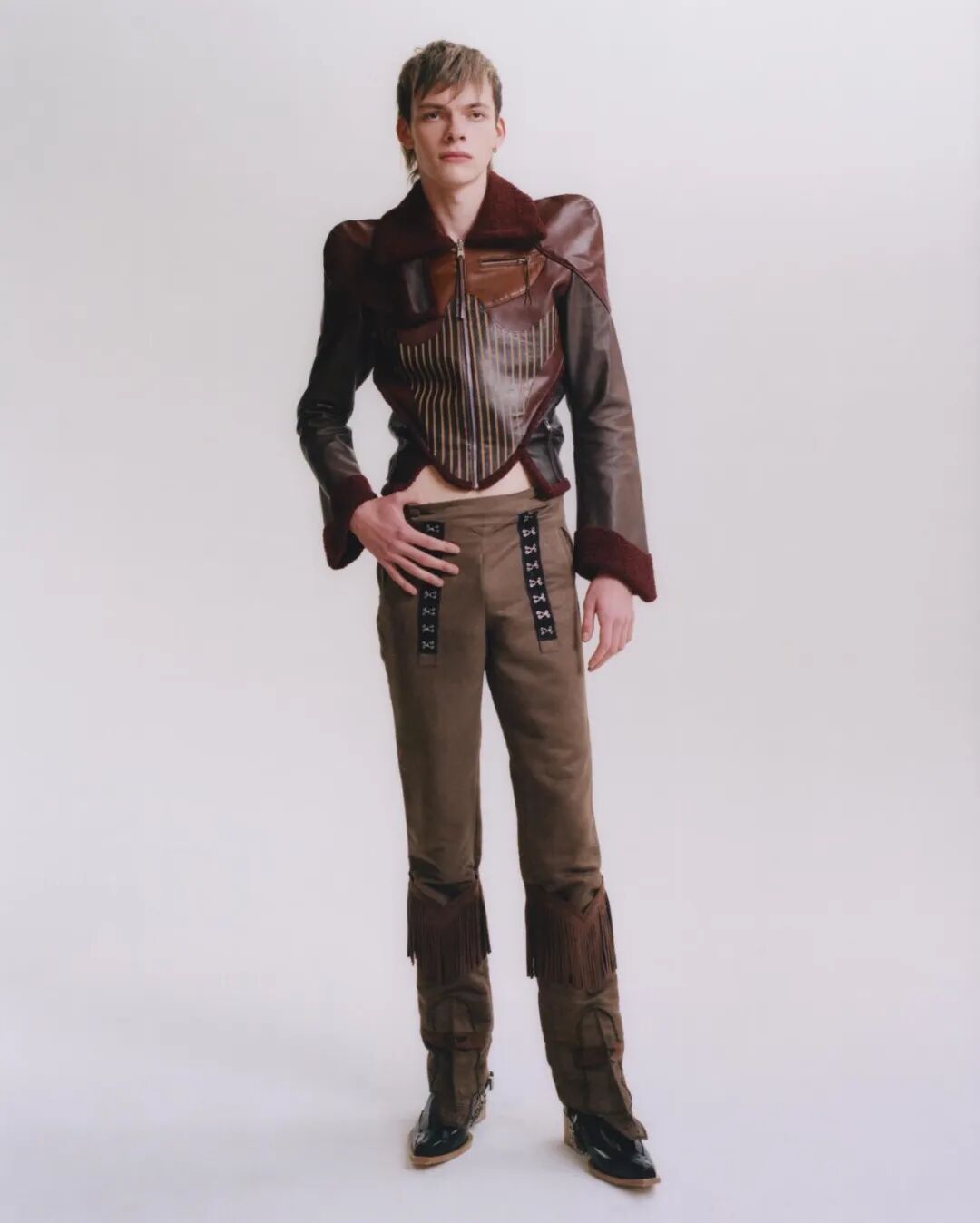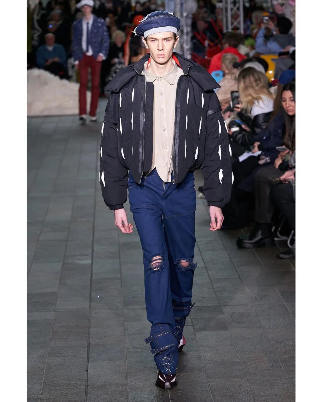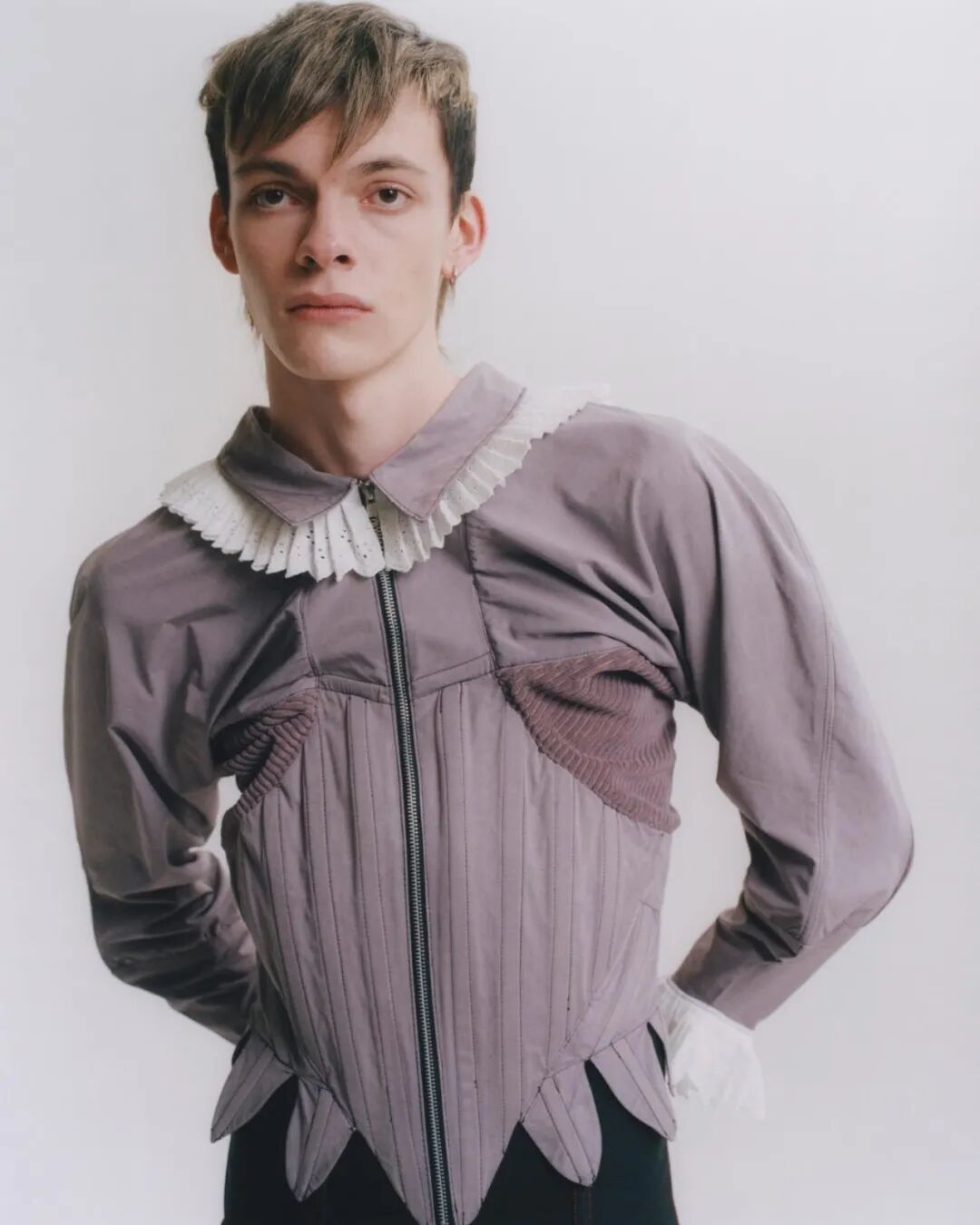割裂设计的连帽遮面面包服、异形分割水洗单宁裤、拓模护膝皮裤、紧身胸衣状的polo针织衫等别致设计,为学院风增添了不同寻常的亚文化色彩。Juntae Kim仿佛《死亡诗社》中的老师在第一堂课上要学生们做的第一件事一般,撕下了这陈规旧俗桎梏的第一页纸,叫我们相信:在性别、体型,乃至万事万物中——