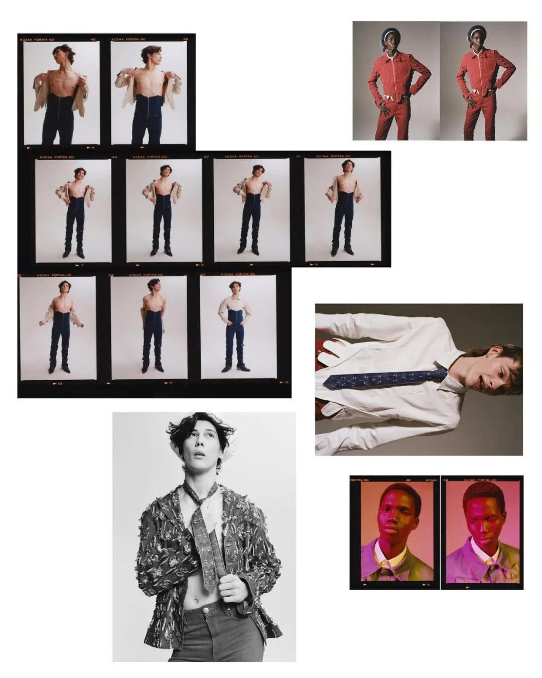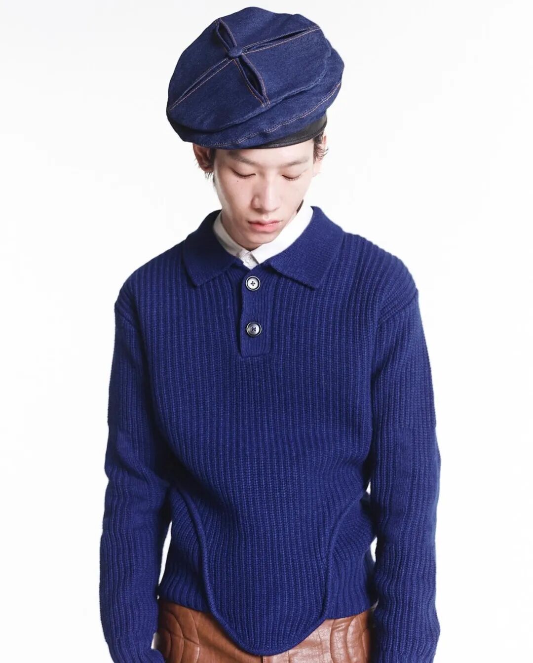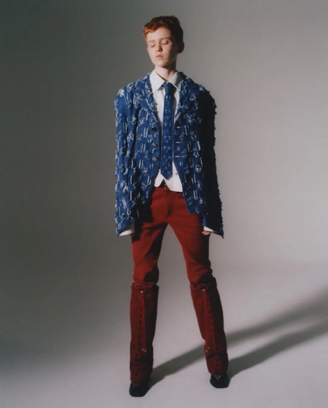 这是设计师意图打破传统、在性别流动的时尚之上开辟全新流派的一次尝试。学院派经典的着装方式、带有领带的三件套套装,与品牌生动配色、标志性水洗元素相融,JUNTAE KIM将1950年的学院带入了自己的世界。设计师通过剪裁分割将男女校服形式进行融合,以破坏往往由性别、阶级和体型定义的美的标准。