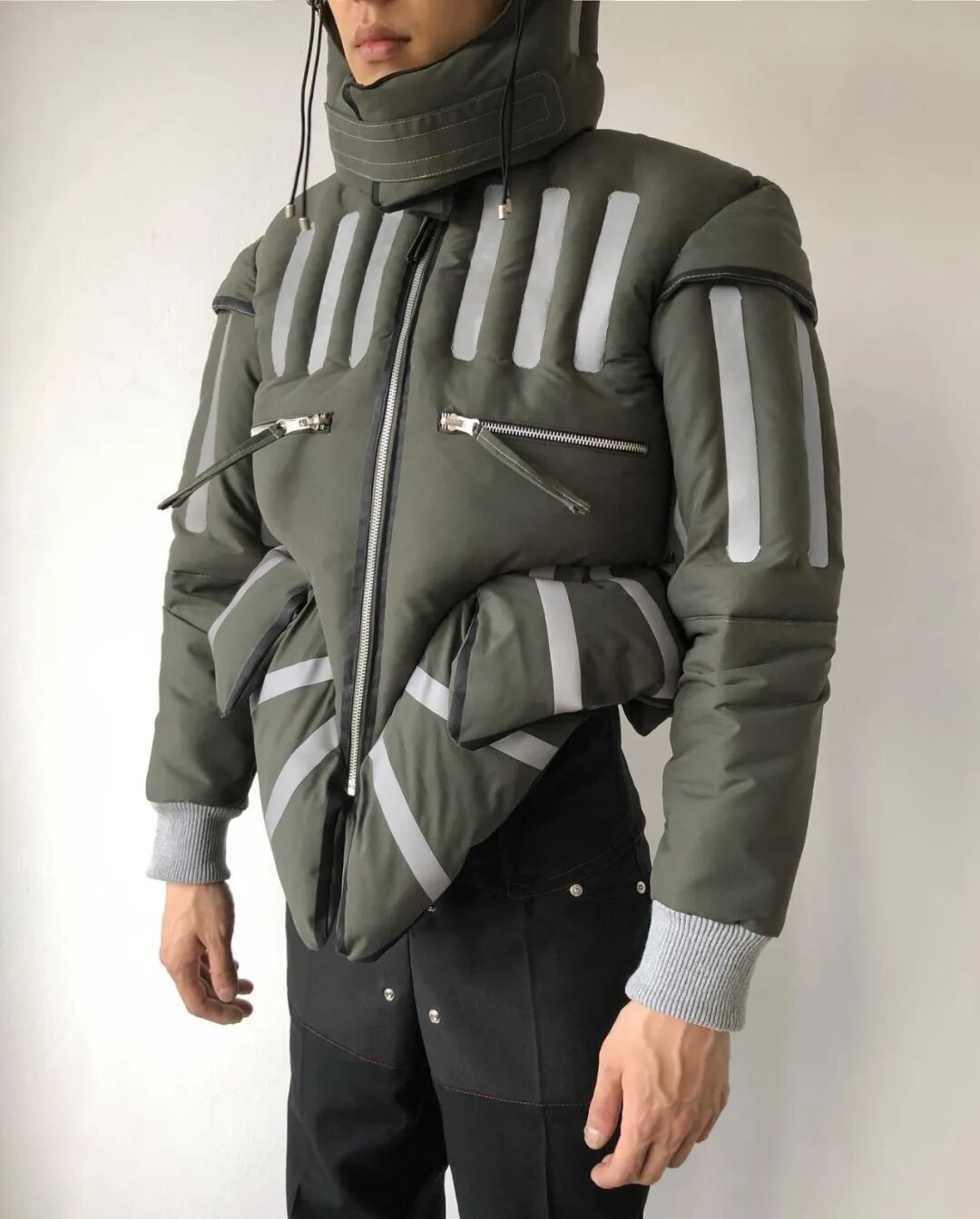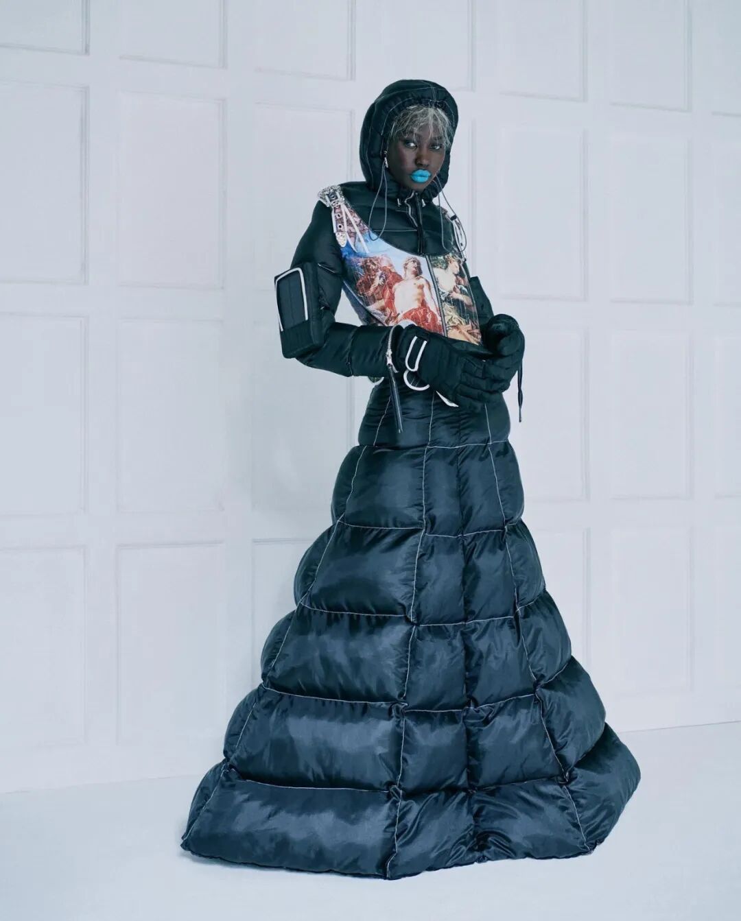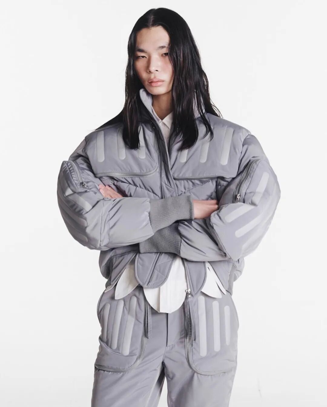 羽绒长裙由纯手工度量打造,配以带有USB端口的折叠便携式太阳能充电器与3M隔热手套,以保证在阴天也能产生持续稳定的输出。流线型分割白色羽绒外套、螺旋形花瓣紧身风衣等单品给固有的男装面貌带来了新启思。