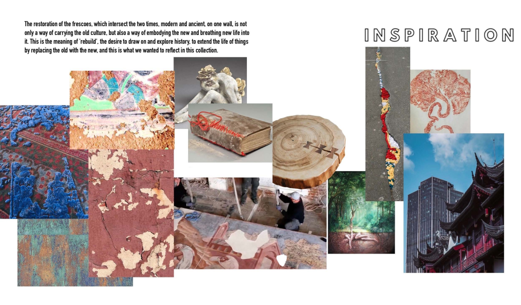 壁画的修复,将现代与古代的两种时光交错在一面墙上,不仅是对于旧文化的承载,也是 对于新事物的一种体现,对其注入新的力量。这也是重塑的意义,希望在历史的长河中不 断汲取,探求,做到以旧换新来延长事物的寿命,这也是我们想在服装中体现的。