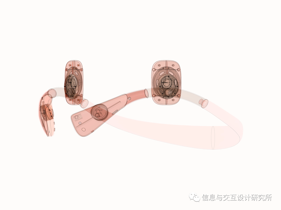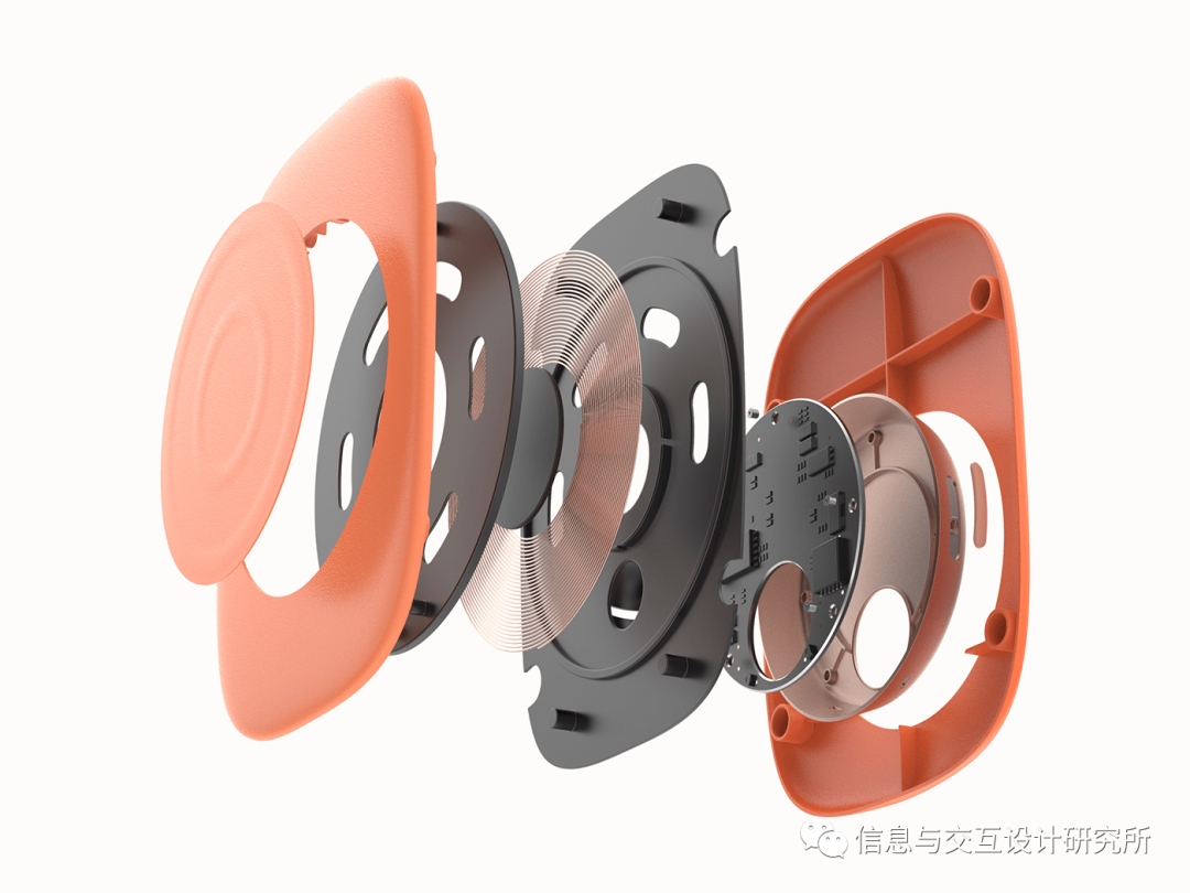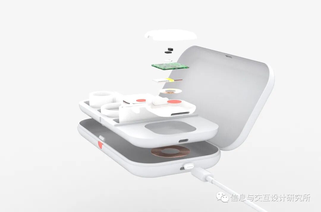 为了涵盖整个使用场景,设计师为可穿戴产品设计了一个家用充电座,用于为用户日常在各种场景下使用产品提供电力支持。也可以将其当成实用的设备保护外壳,便于旅行时随身携带。