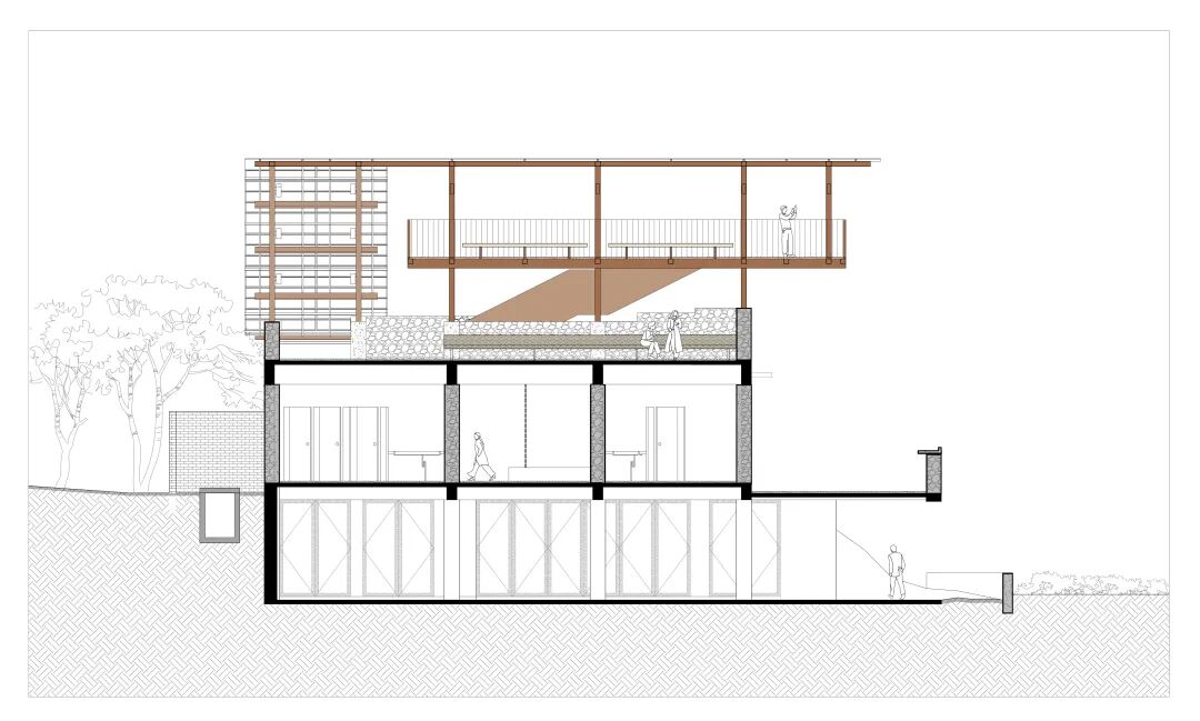 在广场置入木构瓦顶的舞台及展亭,纪念过山瑶并不遥远的建造史。土色钢筋混凝土展墙具有极其近似夯土的颜色和质感,是通过反复实验,调整在混凝土中掺入的氧化铁比例而获得,最终才得以替代结构强度不足的夯土砖墙,保留了传统建造的触感。混凝土使用小块木模板进行浇筑,在过去数十年间,这种浇筑方式曾广泛存在于乡村路桥建设之中。