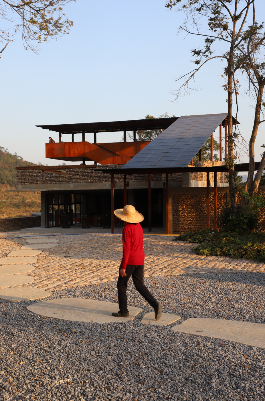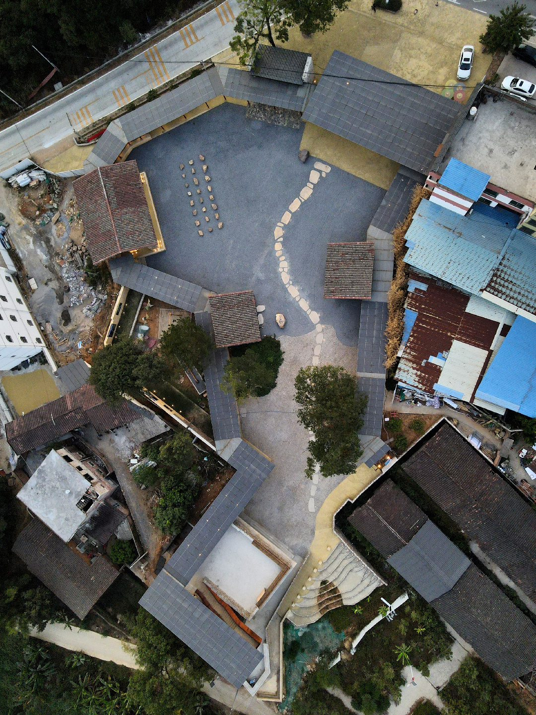 展墙上所开的窄小洞口,是对客家围屋窗洞的提示。回收的夯土砖被砌筑成一段墙体,老木门窗则被回收重构成为展销商店的立面,都形成了与新工艺的比对。河石砌筑作为同样濒临失传的乡村手工建造方式被大量地运用在广场建设中,为仍有手艺的老工匠们提供工作机会。