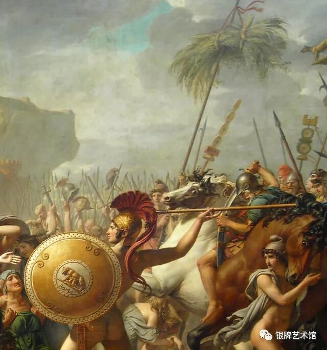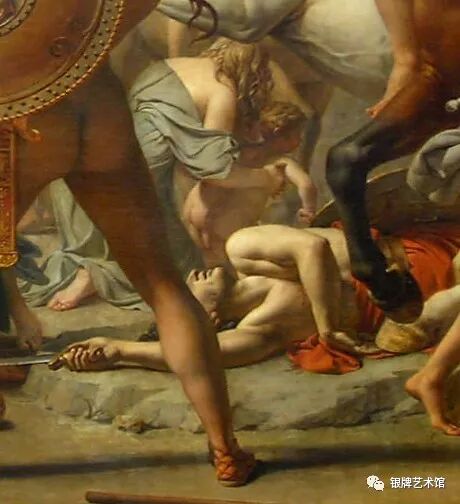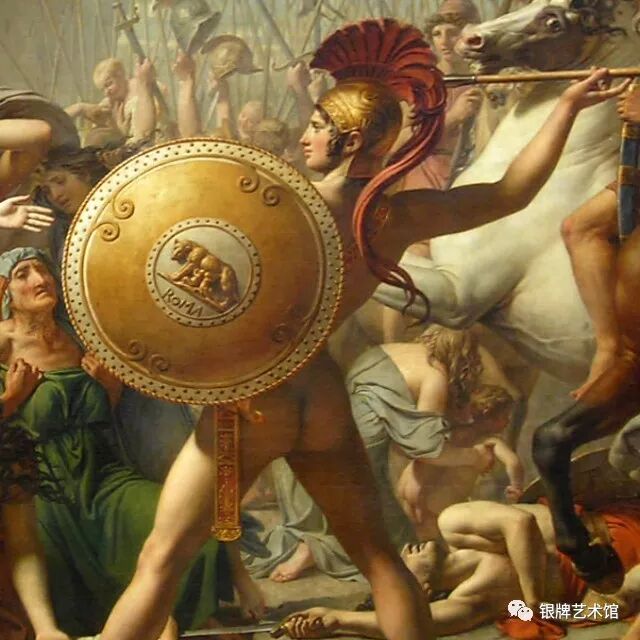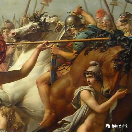 画面中刀枪剑戟、杀气腾腾,人物表情却冷漠缺乏生气,暴露了新古典主义绘画形式美的程式化,理性的构思冲淡了艺术美的真实激情。