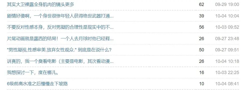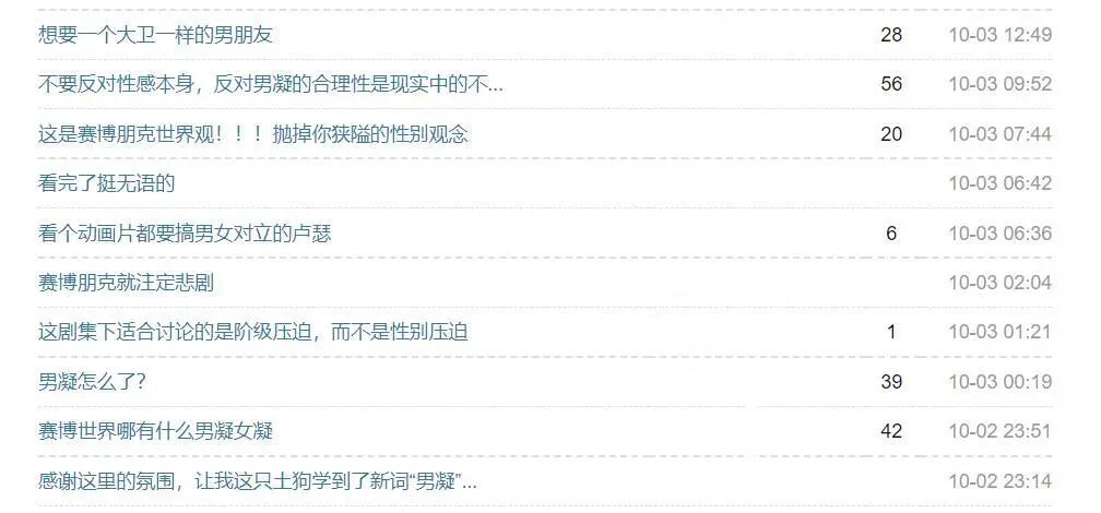 也有观众认为这本就是一部成人向动画,未来赛博朋克世界的世界观也和当下有所不同,男主角大卫也有很多裸露的镜头。这些讨论也让本就热度不减的评论区因“男性凝视”跟“女性凝视”的讨论再度掀起了一番风云。