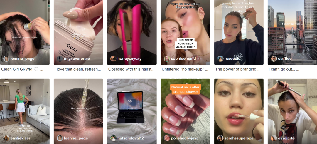 #cleangirlaesthetic“干净女孩美学”是Tik Tok上现已站稳脚跟的一种审美。其包括以下元素:梳得平平的头发(配合精油发蜡之类)、透明唇彩、光泽感皮肤和极简妆容。