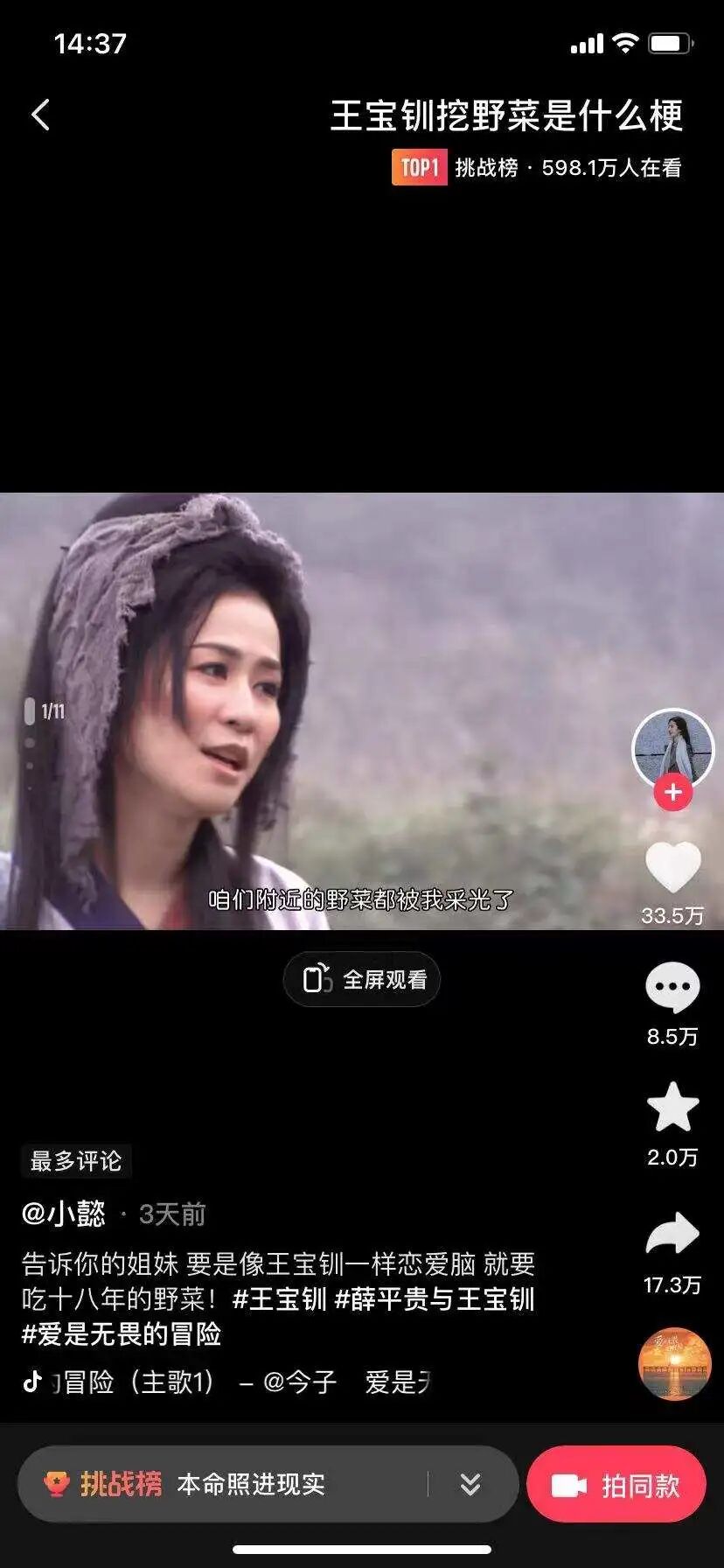 #王宝钏挖野菜 是指当网友们在社交平台看到甜甜的、想恋爱的视频后,为了防止自己长出“恋爱脑”,会去看王宝钏挖野菜。