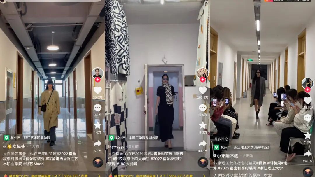 走秀的同学大多是服装表演专业,互相搭配私服。专业又煞有介事的台步、搭表情往往让人一瞬间恍惚——我是不是真的在看秀?通常该视频会带上“封校状态下的大学生”的标签,最近以大学宿舍为灵感和背景的整活短视频越来越多。