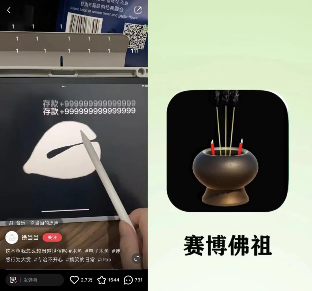 类似的赛博求佛行为还有“电子木鱼”,点击屏幕一下就可以功德+1,“功德”还可以被替换为个人愿望,如“发财”等。