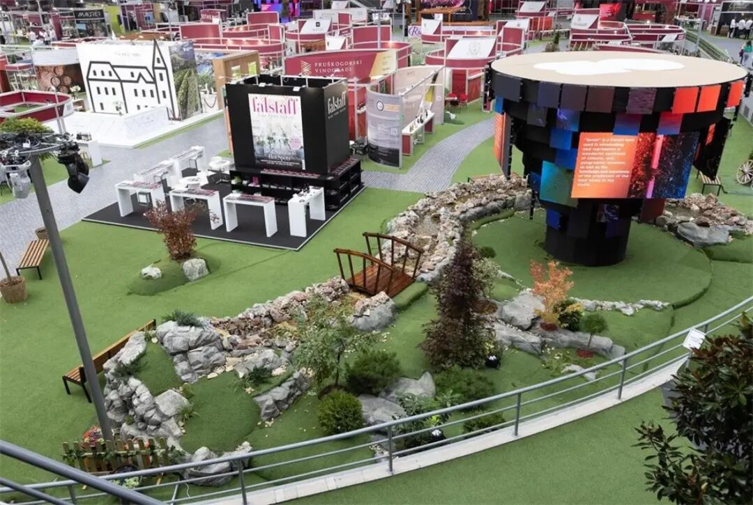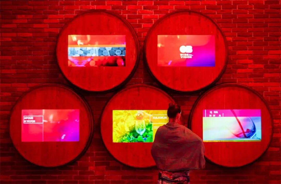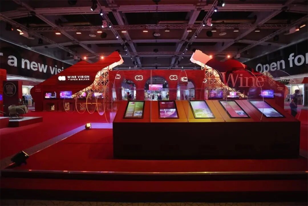 室内装饰是通过安装一条真水人工河完成的,这条河流过大厅底层的一部分。此外,不同形式的品牌化设计为开放巴尔干葡萄酒愿景的视觉冲击做出了贡献。特别吸引游客的是所谓的 “数字集群”,放置在贝尔格莱德博览会1号馆的四个地方。这四个巨大的钢铁装置每一个都有6x5.5米的尺寸,重量超过3吨,并且在每个上都有130个LED屏幕,播放不同的视听内容。