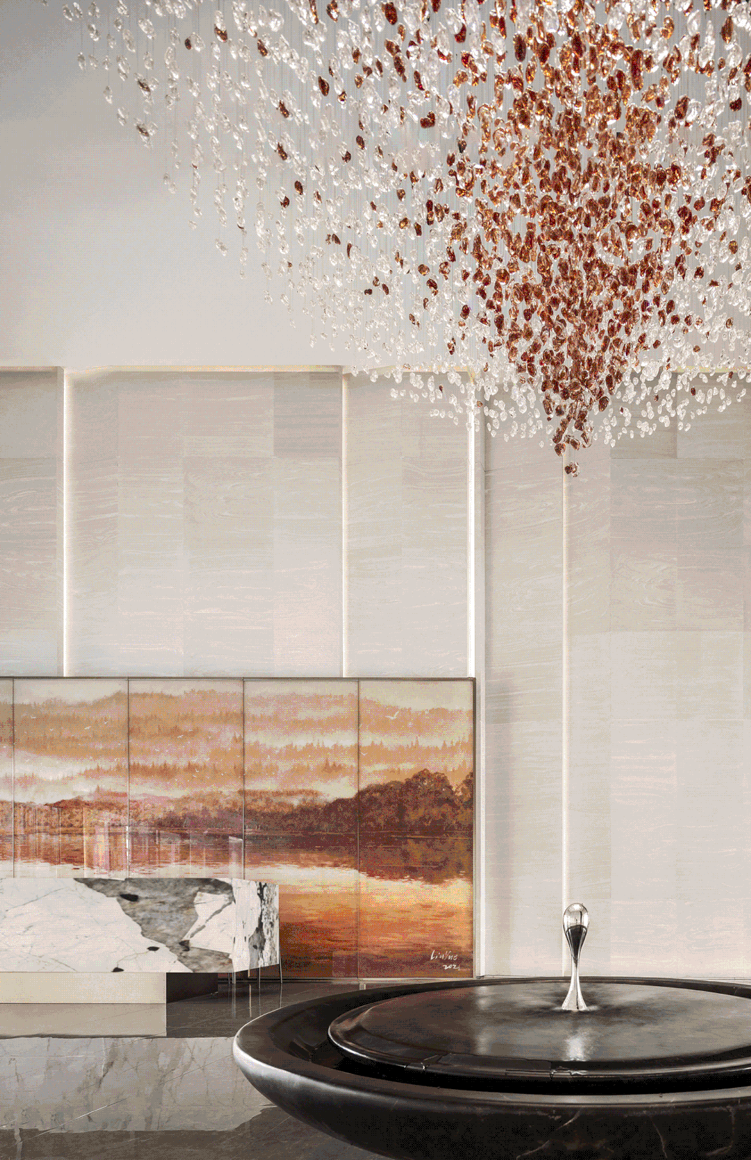 在万景百年看来,东方不是“仿古”,而是着眼于古今的融合、相接,回归生活的本质与纯美。室内空间布局顺着禅、茶、乐、水、香、花、戏的场景节奏,植入东方生活的同时,也注重空间的复合性与逻辑性。