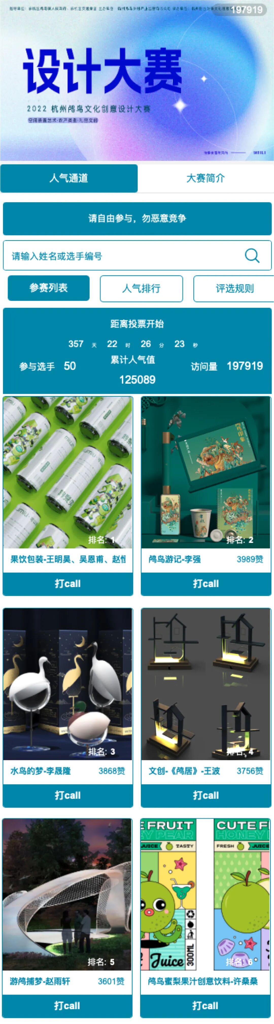 2022杭州鸬鸟文化创意设计大赛自启动以来,获得各院校师生及设计界人士的踊跃参加。本届大赛共收到参赛作品325件。初评已决出50强入围作品,并参与第二阶段网络投票,最终遴选出5名最具人气奖。