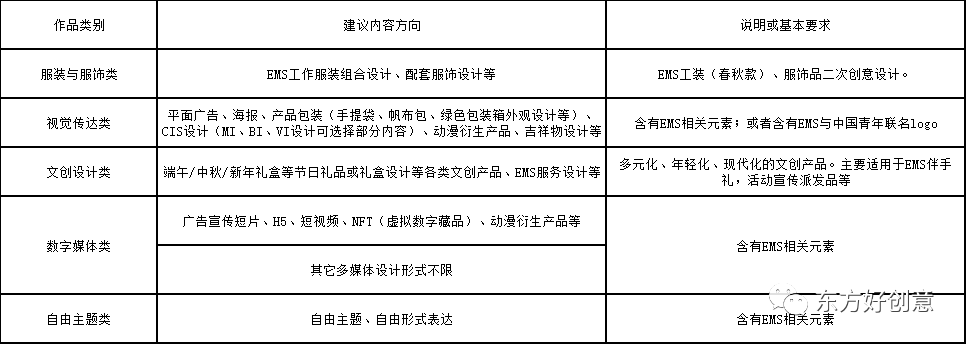 参赛作品方案要求实用性强,兼具生活美学,易于开发与批量生产,突出中国邮政EMS主题文化和现代创意设计的有效融合,强调“创意为美”、“设计为用”,提倡“文化+科技+实用”的设计导向。