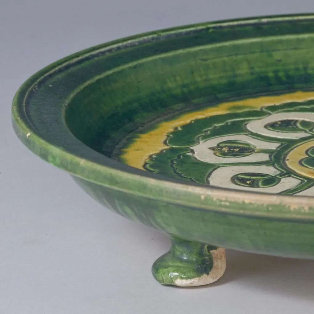 由于采用了素烧工艺,胎体致密,釉色以绿彩为主,色调清新淡雅,在三彩盘中较为少见,堪称唐三彩器中的精品。