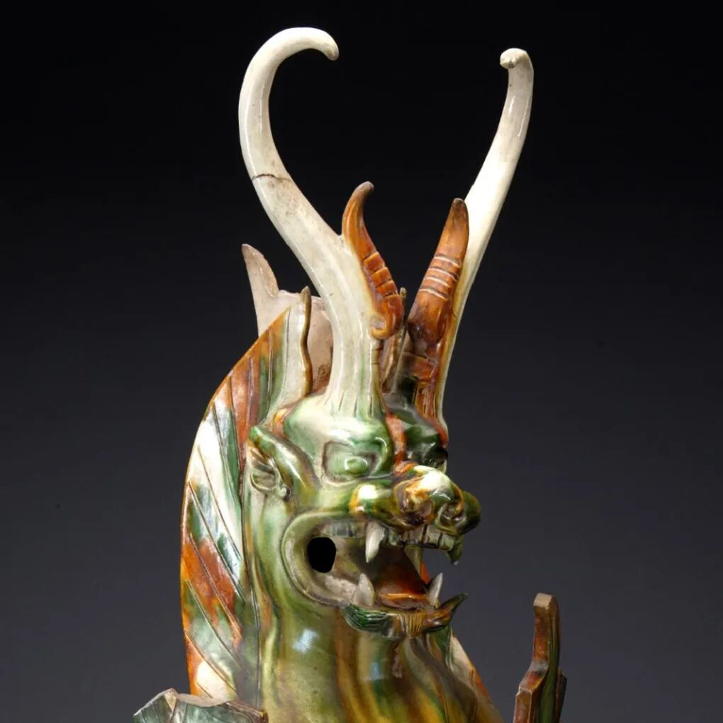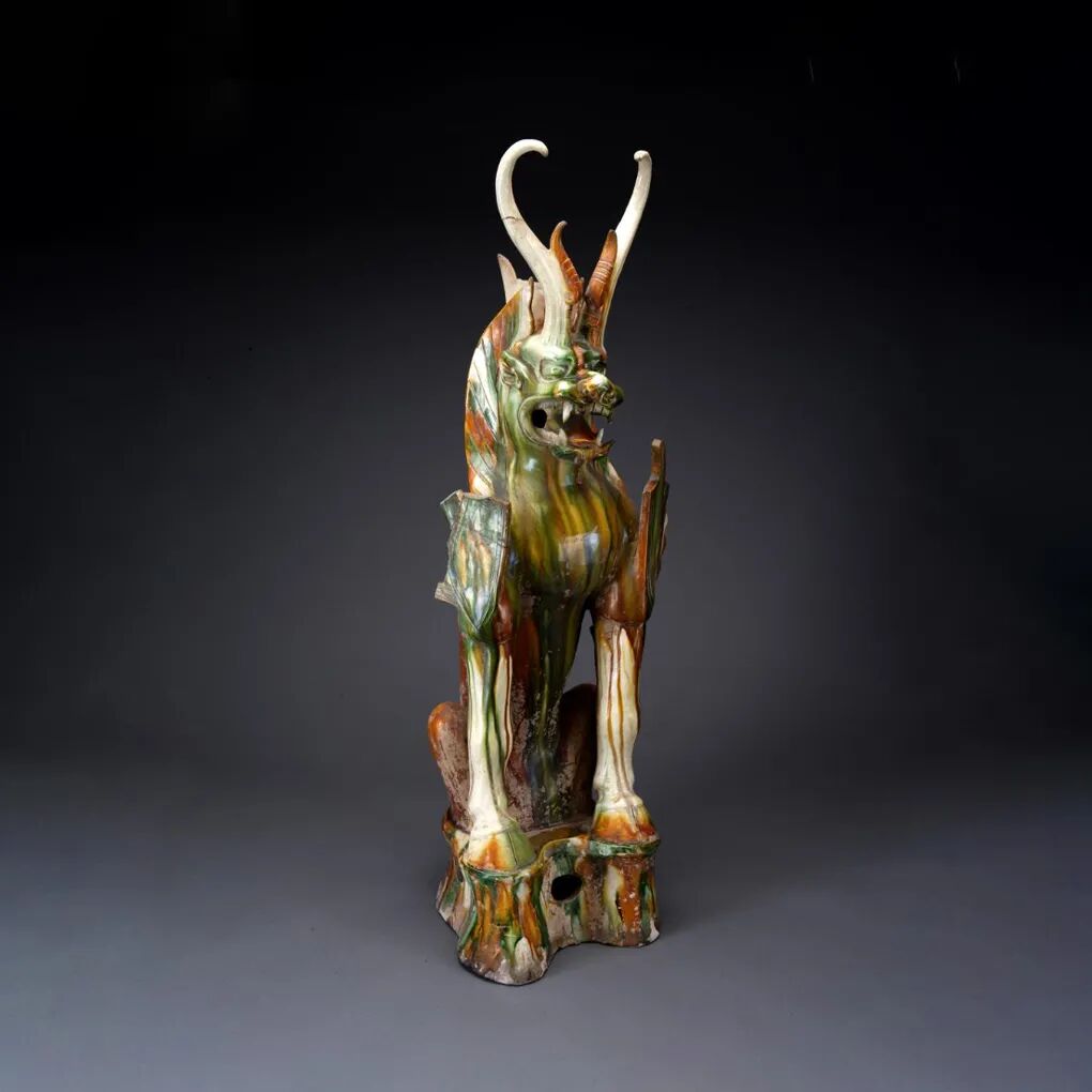此镇墓兽头顶有双弯角,面目狰狞,双眼圆睁,口大张,露出獠牙。肩部饰有双翼,双翼表面饰阴线纹。身体处于蹲立状,下踏山形底座。通体施绿、白、褐三色釉,釉色鲜亮莹润。