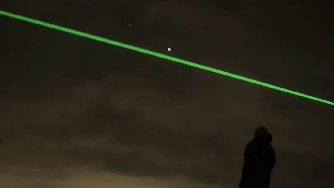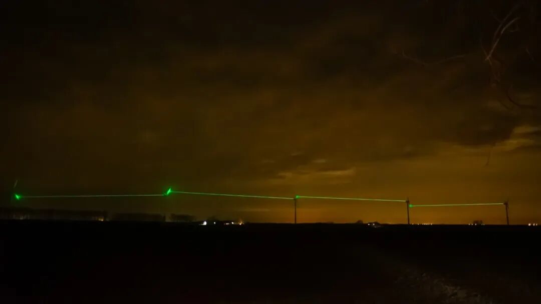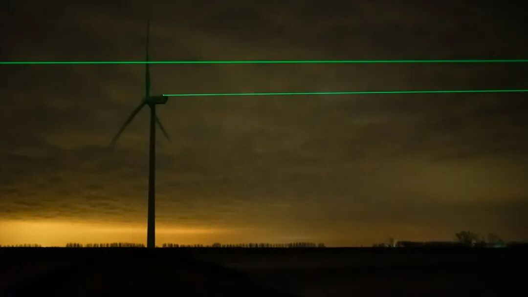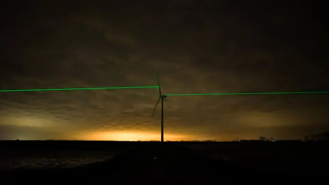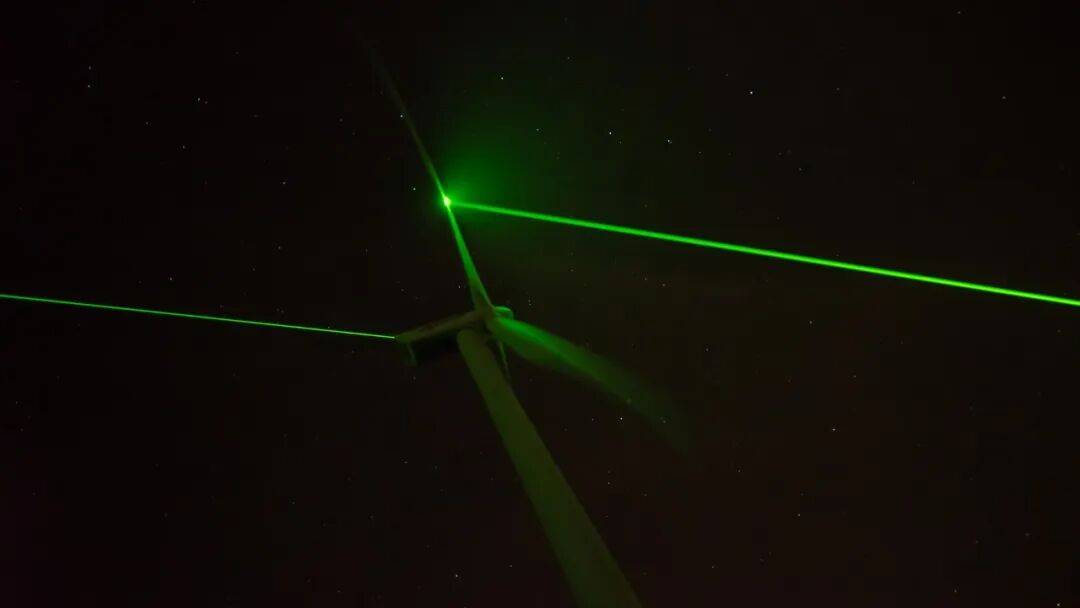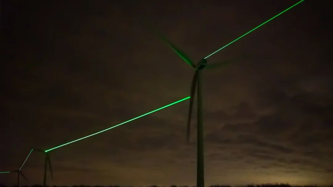 绿色激光束从一个风车的顶部以光速穿越1600英尺的距离发射到下一个风车的叶片,并追随风车叶片同步旋转,完美地实现了对高速运转物体的精准定位!