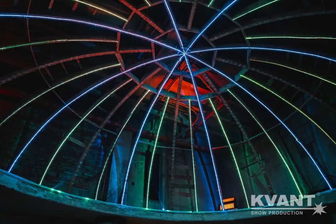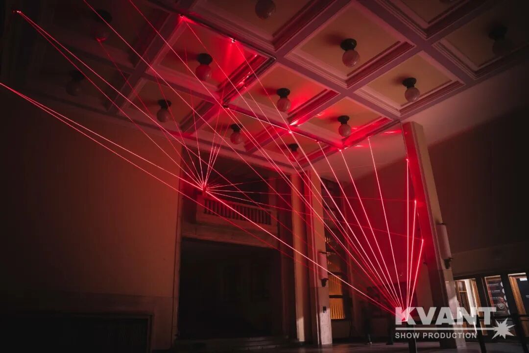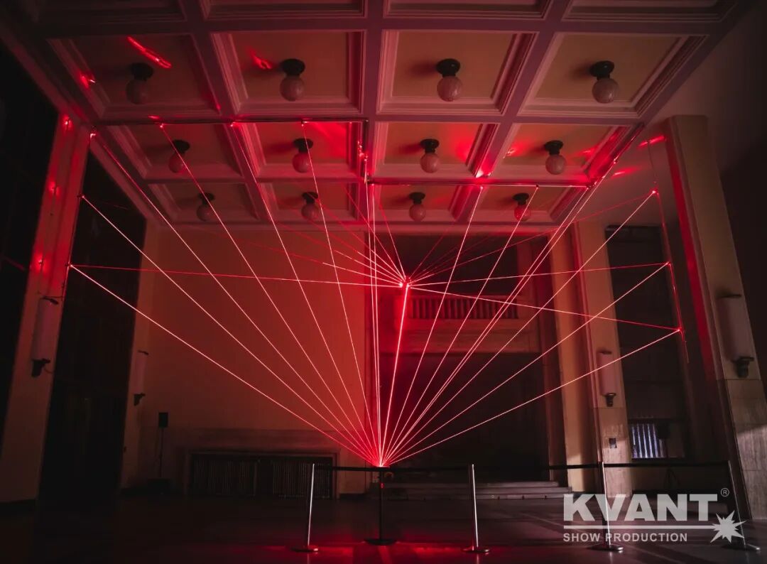 他们使用了KVANT激光灯创造出一个引人注目的灯光装置——空间线条游戏。进入建筑当中,游客便能感受到激光在建筑内交织、分离、融合的画面,感受到巨大的视觉冲击力。