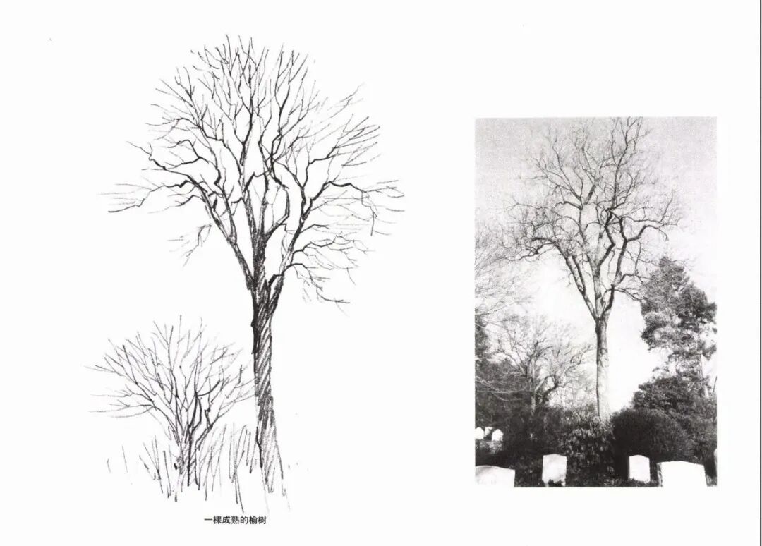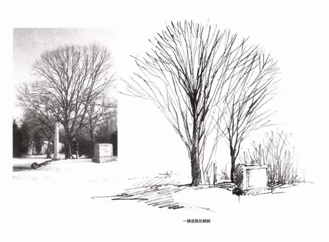 树木可能是所有景观元素中最为重要的一个,同时它也是最难描画的,这是因为树木是一个活着的有机体,它随着时间的流逝也在不断地生长变化。一些树在冬季落叶,一些树在春季开花,所以说季节的不同会改变树木的外形特征还有大风,雨雪和冰冻也会起到这样的效果。